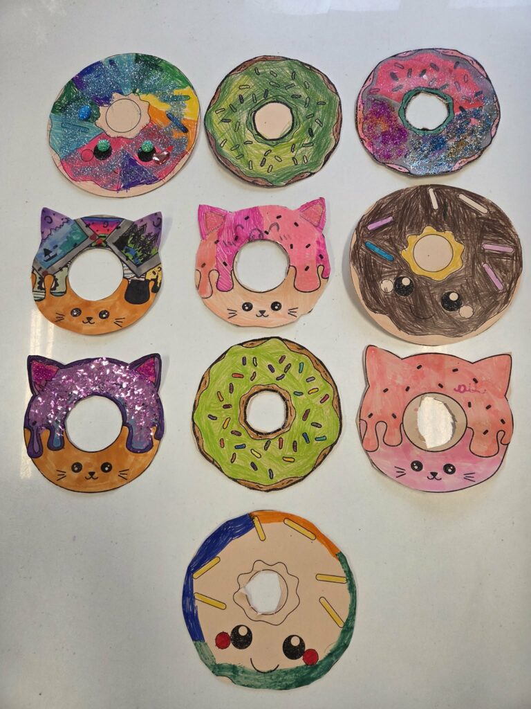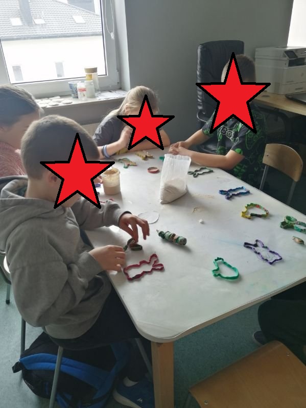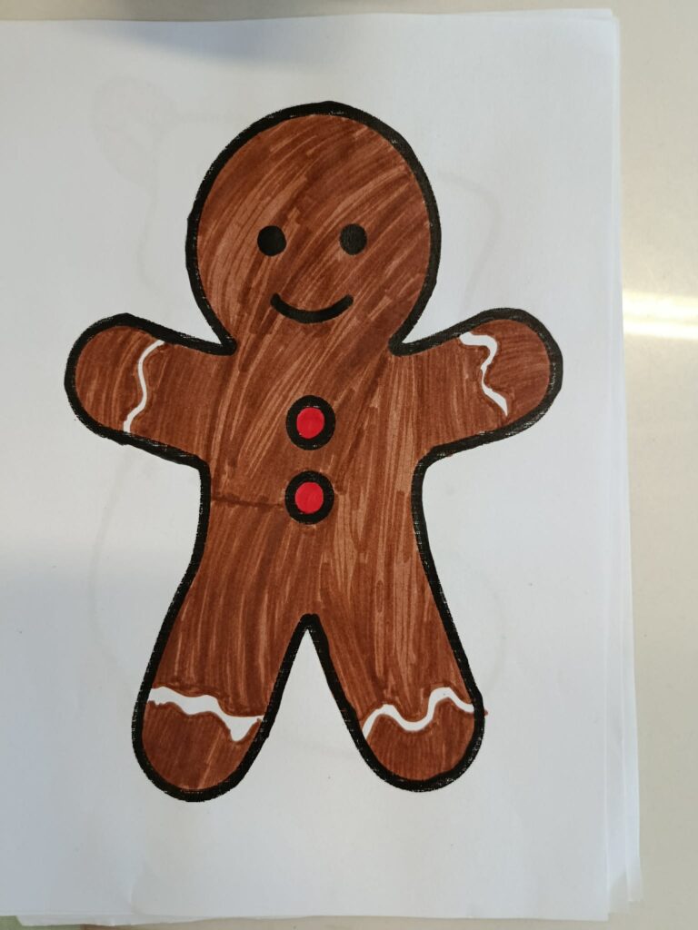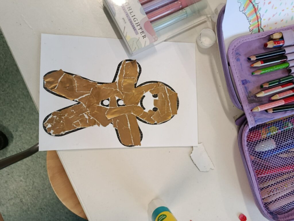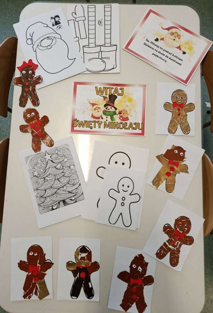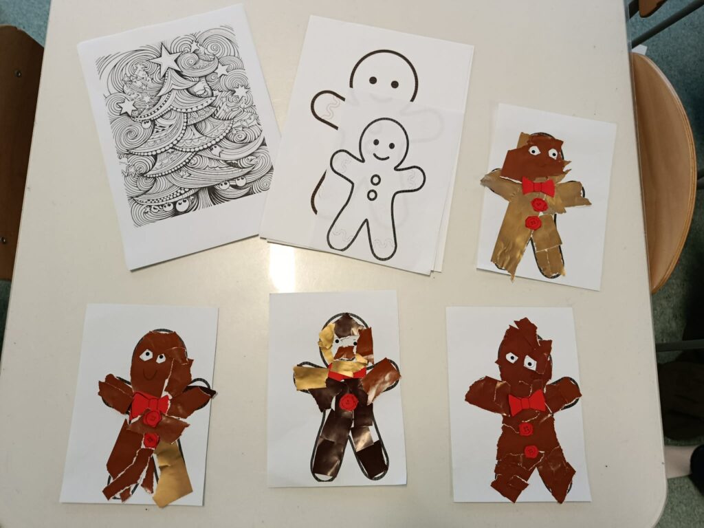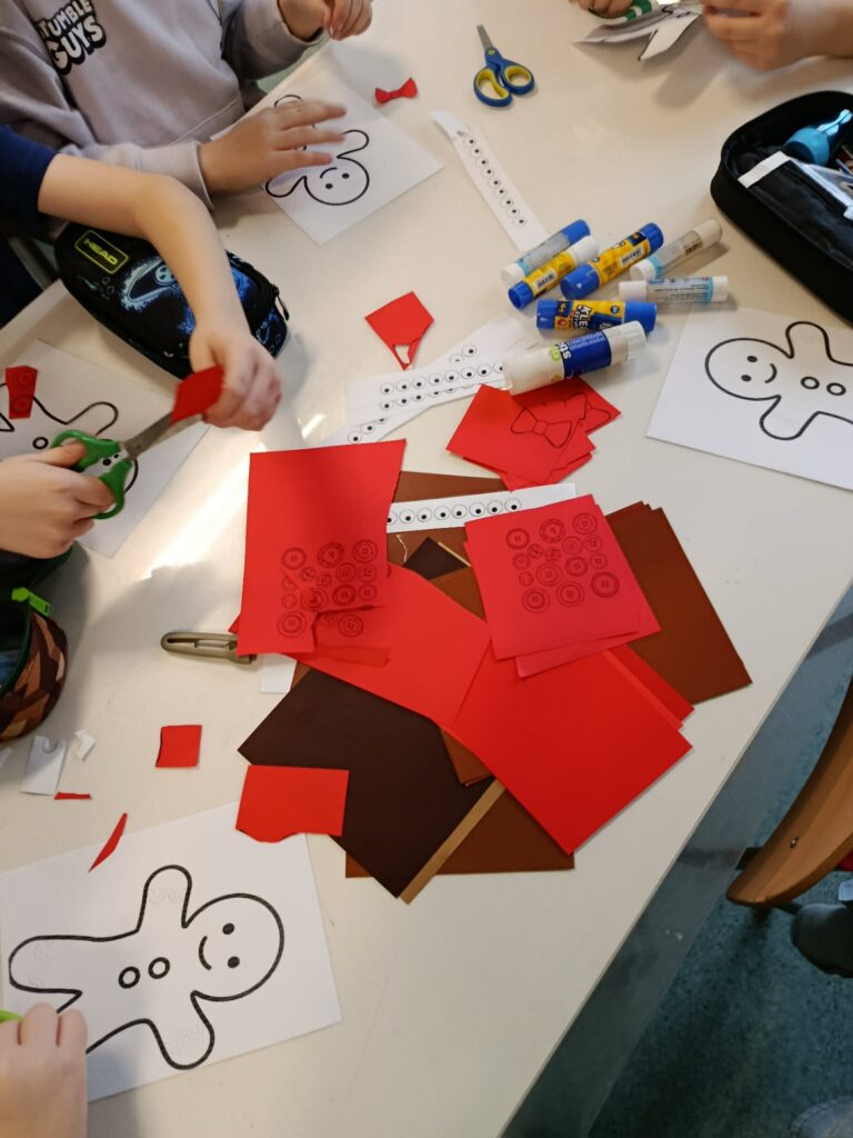 W świetlicy odbyły się radosne zajęcia bożonarodzeniowe wprowadzające dzieci w świąteczny nastrój. Dzieci wykonywały własne prace plastyczne – piernikowe postacie wyklejane papierem w odcieniach brązu i złota, ozdobione guzikami i kokardkami. Podczas zajęć dzieci rozwijały swoją kreatywność, ćwiczyły sprawność manualną oraz uczyły się współpracy. W tle rozbrzmiewały kolędy i piosenki świąteczne, które tworzyły ciepłą, spokojną atmosferę i sprzyjały wspólnemu przeżywaniu świątecznego czasu.