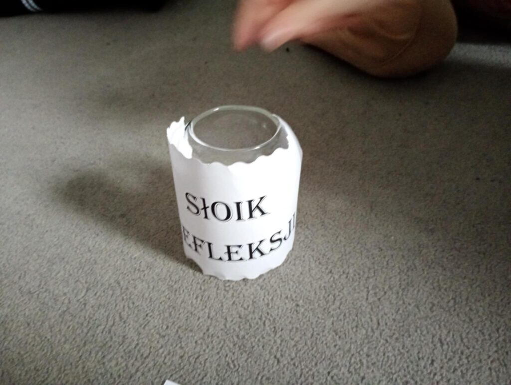 Dzisiaj w świetlicy zrealizowaliśmy kolejne zadanie z projektu „Kreatywny nauczyciel. Misja: Czas – start”. Tematem naszych zajęć był „Czas na refleksję”. Jako, iż nadchodzące święta są idealnym czasem do refleksji, uczniowie poznali definicję refleksji oraz odpowiedzieli sobie na pytanie- dlaczego warto zastanowić się nad różnymi sprawami?. Wspólnie wykonaliśmy ozdobny słoik z pytaniami do refleksji. Dzieci losowały pytania i poddawały refleksji jeden temat.