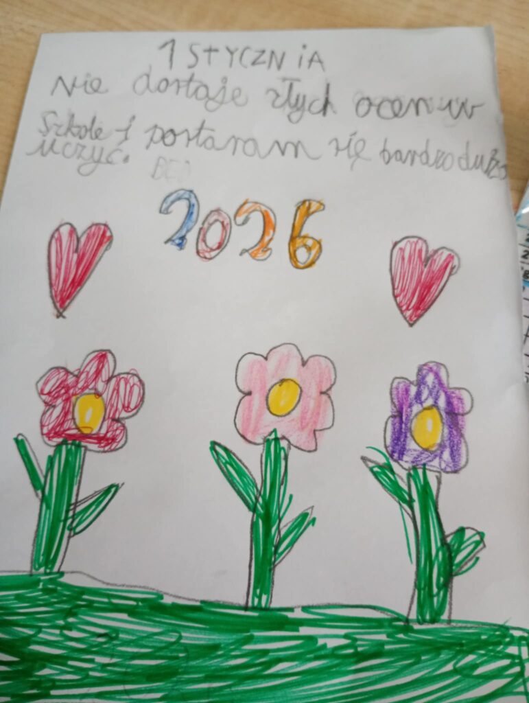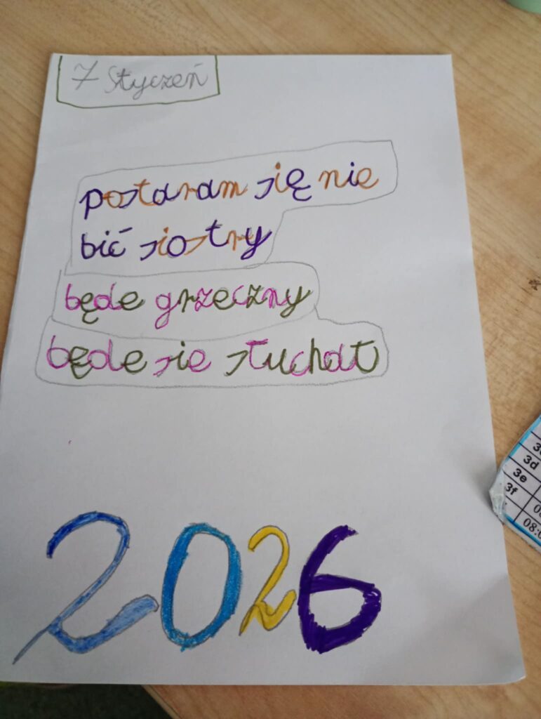 W piątek 13.01 świetlica starszych klas rozmawiała na temat postanowień noworocznych. Wyjaśniliśmy sobie pojęcia oraz wymieniliśmy różne postanowienia. Dzieci przygotowały kartki z kalendarza ze swoimi postanowieniami.