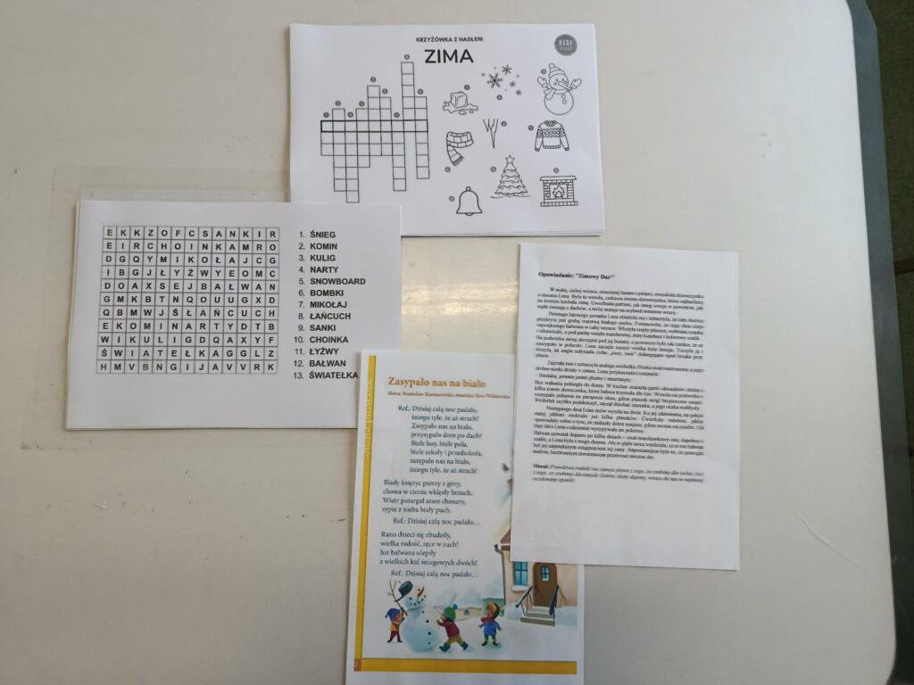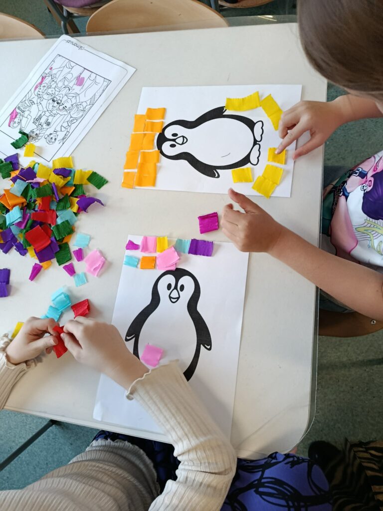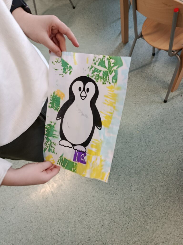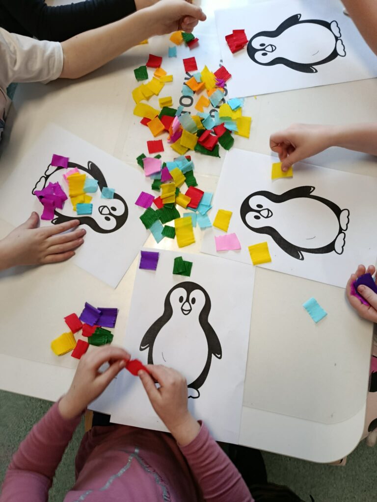 Podczas piątkowych zajęć w świetlicy dzieci wysłuchały opowiadania pt. „Zimowy Dar” z morałem o życzliwości i wzajemnej pomocy. W części plastycznej wykonały pracę pt. „Pingwin” , poznając technikę spryskiwania kolorowej bibuły wodą, która tworzyła ciekawe, barwne wzory. Zajęcia rozwijały kreatywność oraz sprawność manualną dzieci. Na zakończenie zajęć świetliczaki rozwiązywały krzyżówki i wykreślanki o tematyce zimowej.