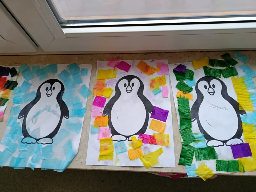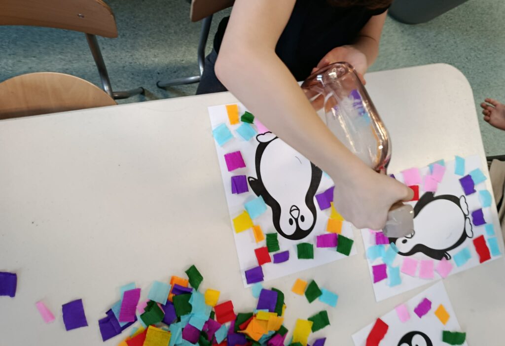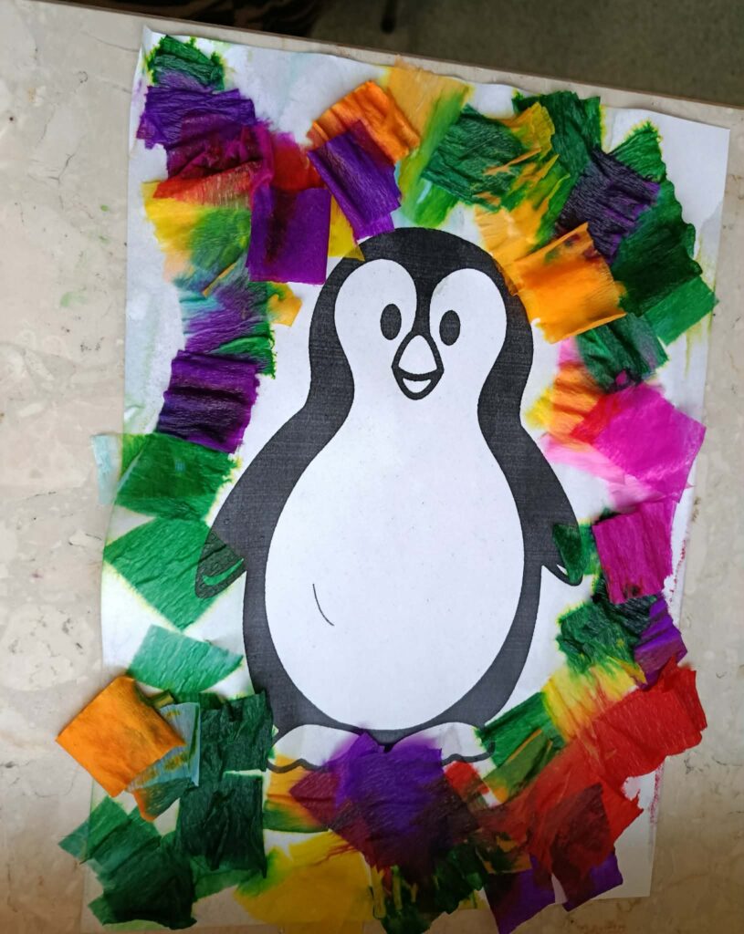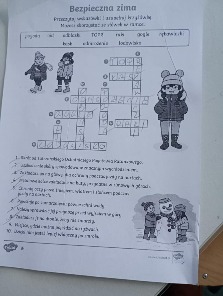 Podczas piątkowych zajęć w świetlicy dzieci wysłuchały opowiadania pt. „Zimowy Dar” z morałem o życzliwości i wzajemnej pomocy. W części plastycznej wykonały pracę pt. „Pingwin” , poznając technikę spryskiwania kolorowej bibuły wodą, która tworzyła ciekawe, barwne wzory. Zajęcia rozwijały kreatywność oraz sprawność manualną dzieci. Na zakończenie zajęć świetliczaki rozwiązywały krzyżówki i wykreślanki o tematyce zimowej.