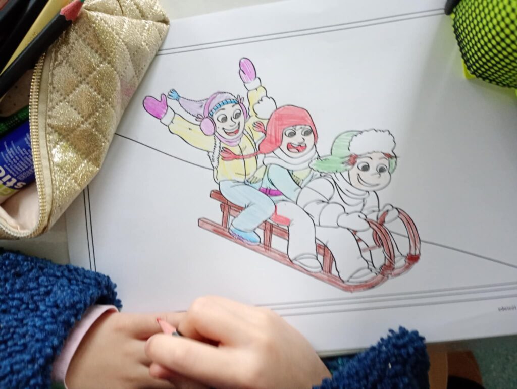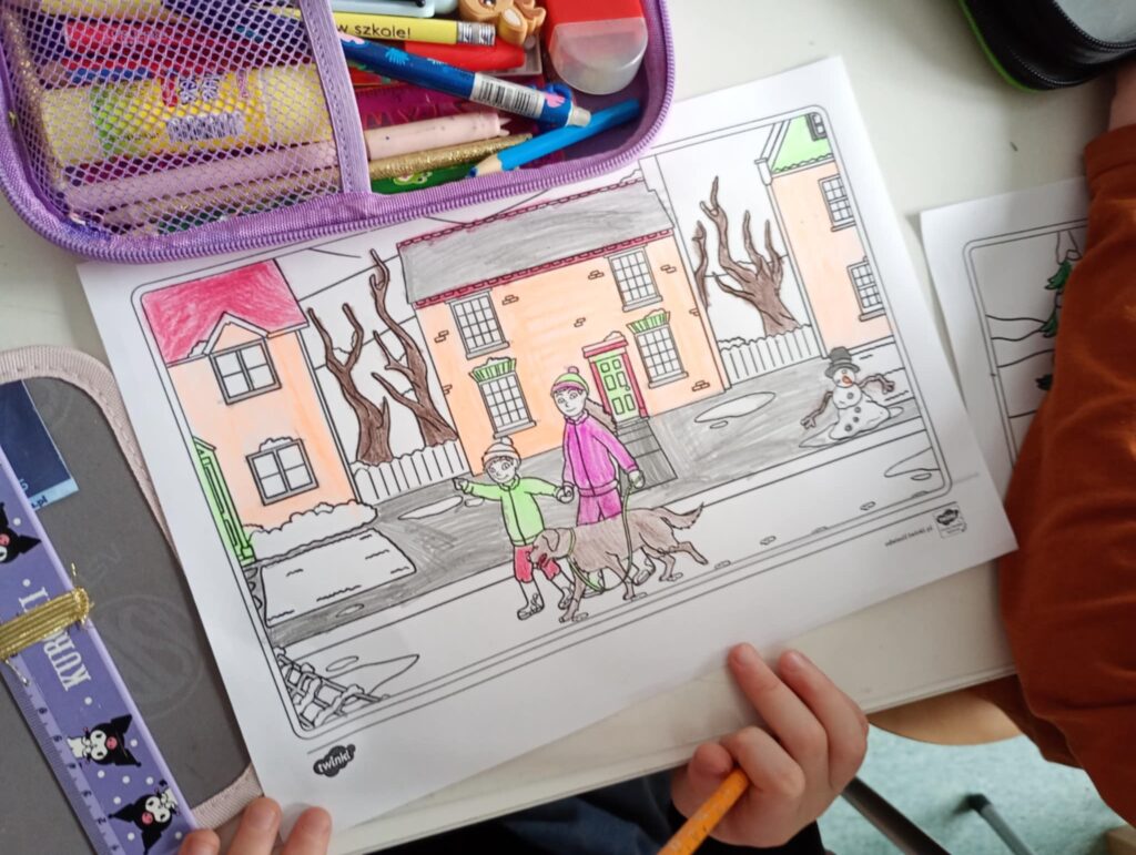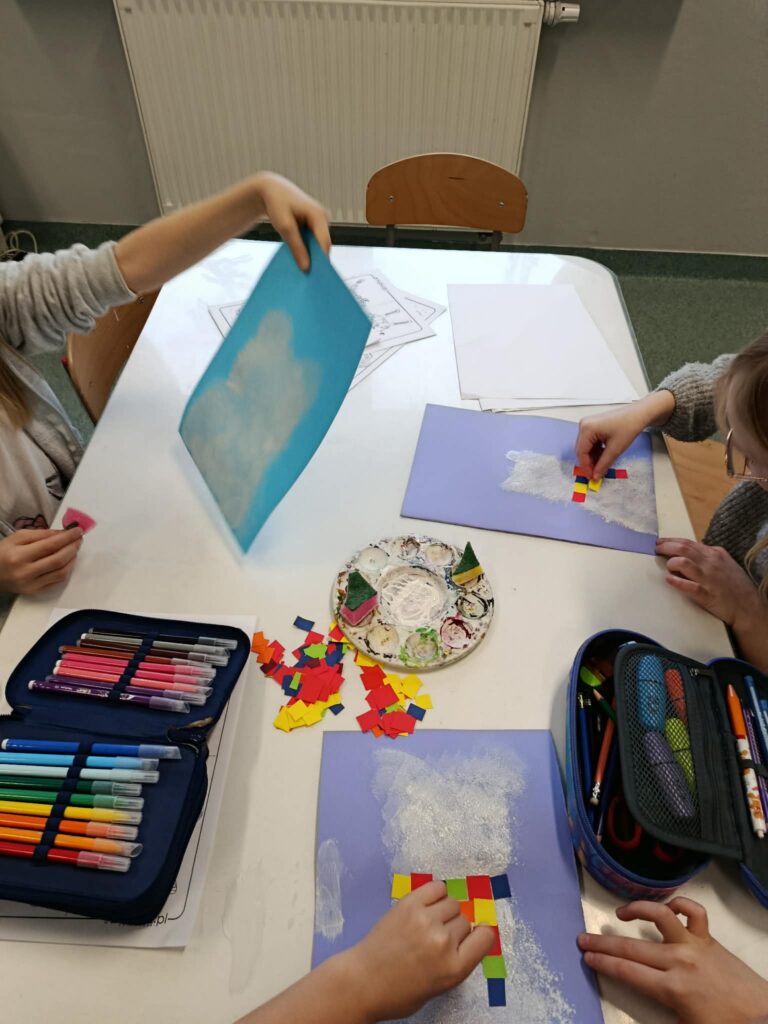W tym tygodniu w świetlicy rozmawialiśmy o zmianach zachodzących za oknem wraz z nadejściem zimy. Dzieci wysłuchały wiersza Czesława Janczarskiego pt. „Mroźna zima”, który był wprowadzeniem do rozmowy, na temat zimowej aury i jej wpływu na przyrodę. Zorganizowano również zabawy ruchowe przy piosenkach świątecznych: „Pada śnieg” – zabawa naśladowcza oraz „Mikołaj puka do drzwi” – zabawa rytmiczna, które sprawiły dzieciom wiele radości i pozwoliły na aktywne spędzenie czasu. Na zakończenie dzieci wykonały pracę plastyczną pt. „Kamienice zimą”, rozwijając swoją kreatywność i zdolności manualne.