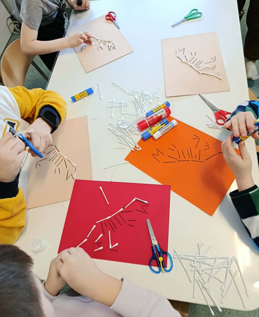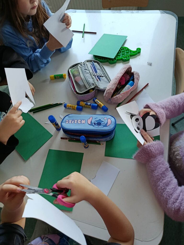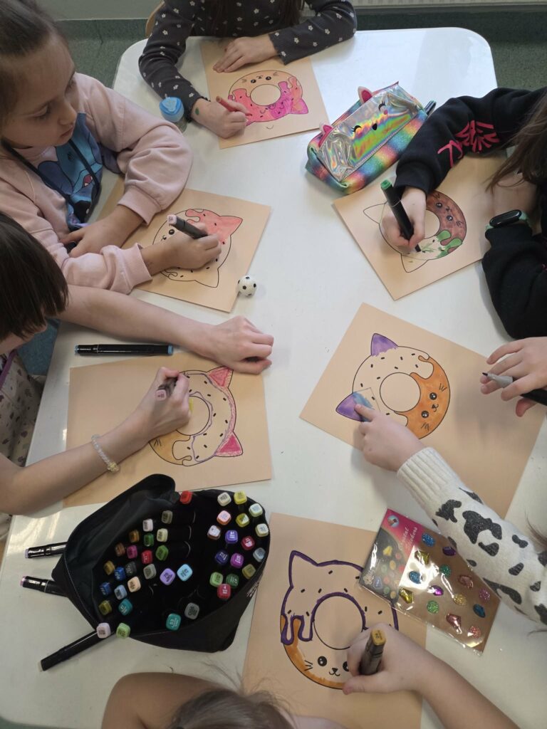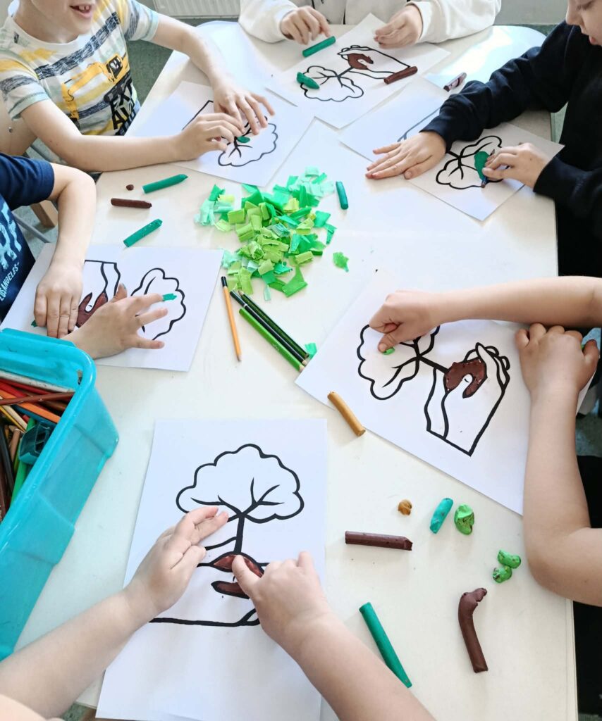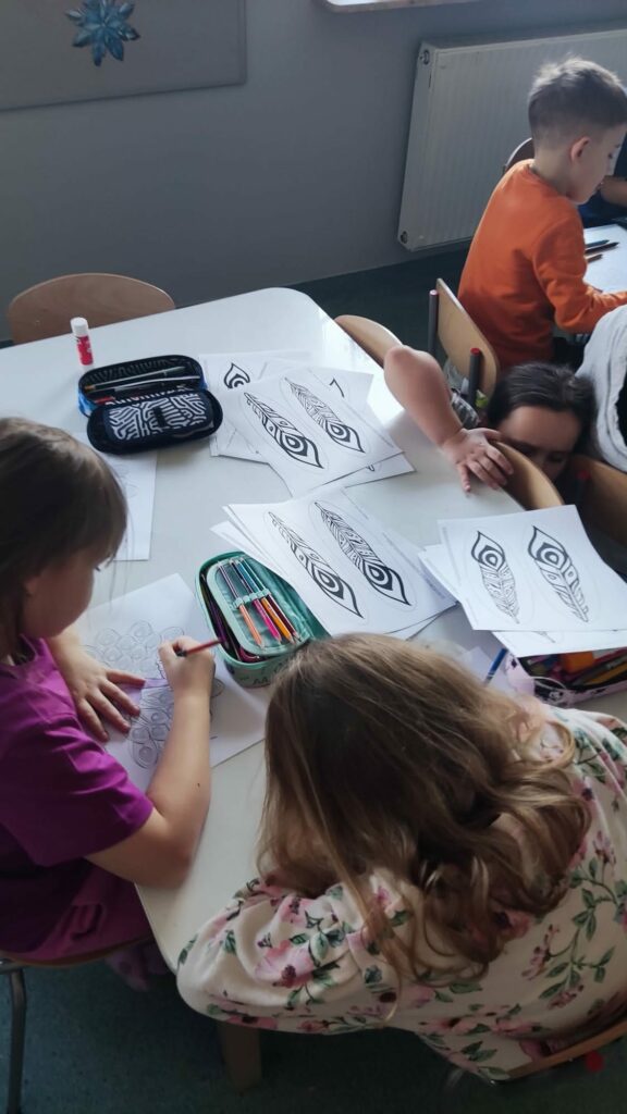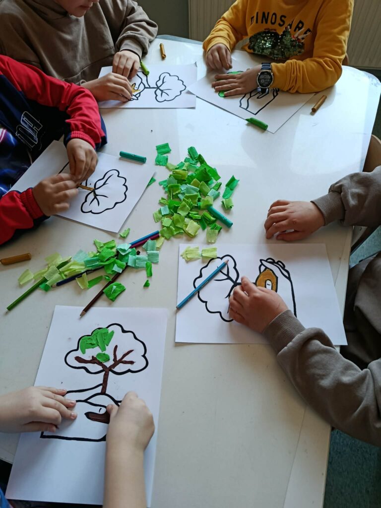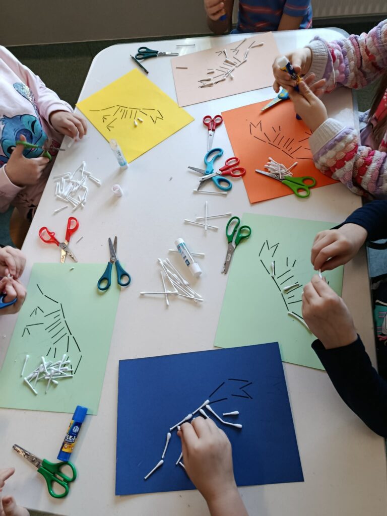 18 listopada w świetlicy dzieci tworzyły kolorowe drzewo z papierowych kół i guzików. Najpierw rozmawialiśmy o różnych rodzajach drzew i jesiennych zmianach. W części plastycznej wykonaliśmy własne spirale, które następnie przykleiliśmy na dużą sylwetę drzewa, tworząc barwną pracę grupową. Zajęcia rozwijały wyobraźnię, motorykę małą i współpracę.