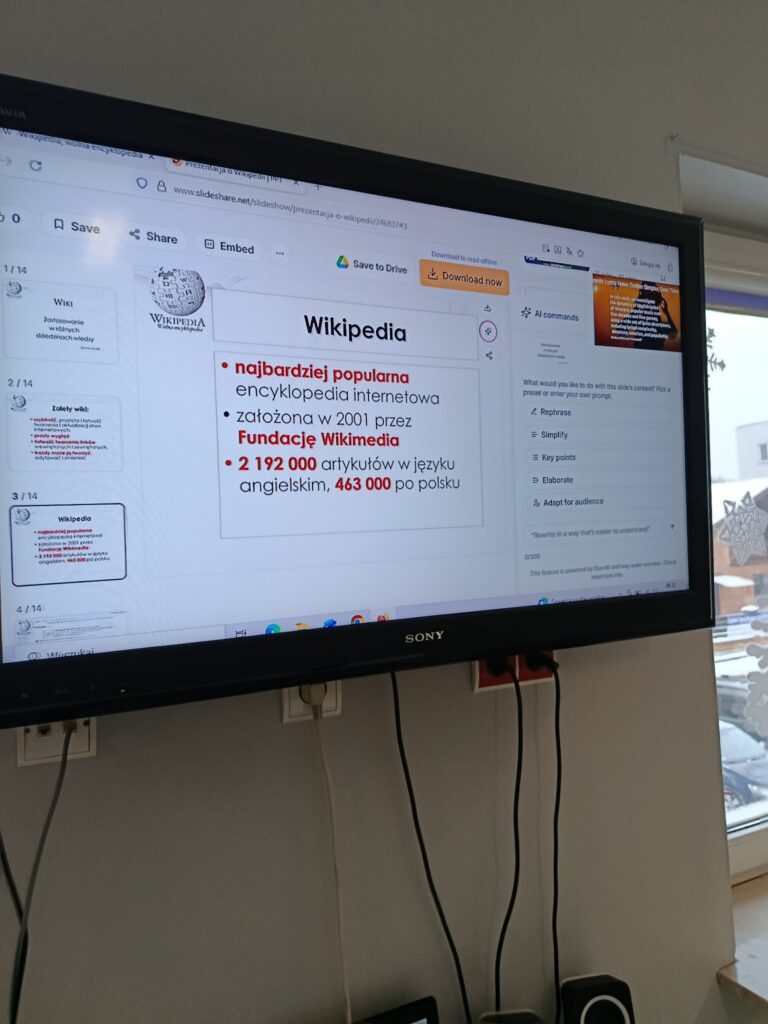 15.01. – Dzień Wikipedii. Świetliczaki obejrzały prezentację pt. „Wikipedia” i dowiedziały się, czym jest darmowa, wielojęzyczna encyklopedia internetowa. W części praktycznej dzieci wyszukiwały informacje oraz hasła w Wikipedii. Zajęcia rozwijały umiejętność samodzielnego wyszukiwania informacji w Internecie.