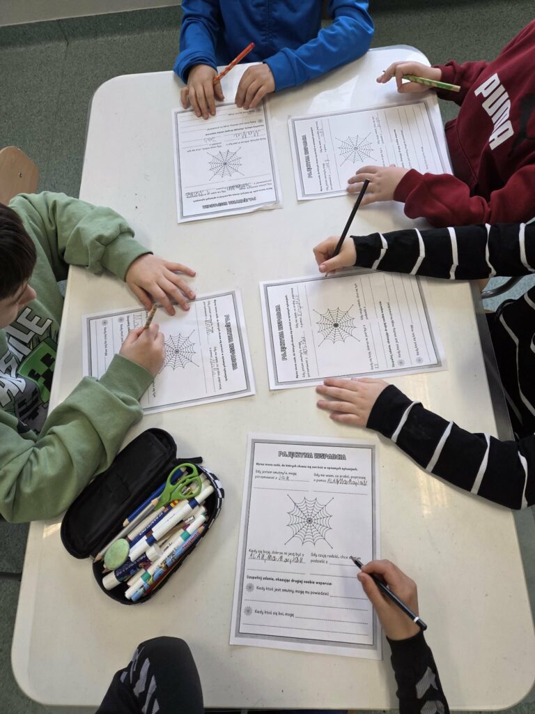 W tym tygodniu w świetlicy zrealizowaliśmy kolejne zadanie „SIATKA WSPARCIA-RAZEM DAMY RADĘ” z modułu III Ogólnopolskiego Projektu Edukacyjnego „MOC RELACJI- SIŁA BEZ PRZEMOCY”. Świetliczaki wspólnie budowały trasę drogi zaufania”, wykonały zadania: „Prowadzimy przez trudności”, „Tajemniczy rysunek- ćwiczenie uważnego słuchania”, „Siatka wsparcia”, karty pracy „Pajęczyna wsparcia”, a na koniec wkleiły pieczęć wsparcia do Księgi Relacji