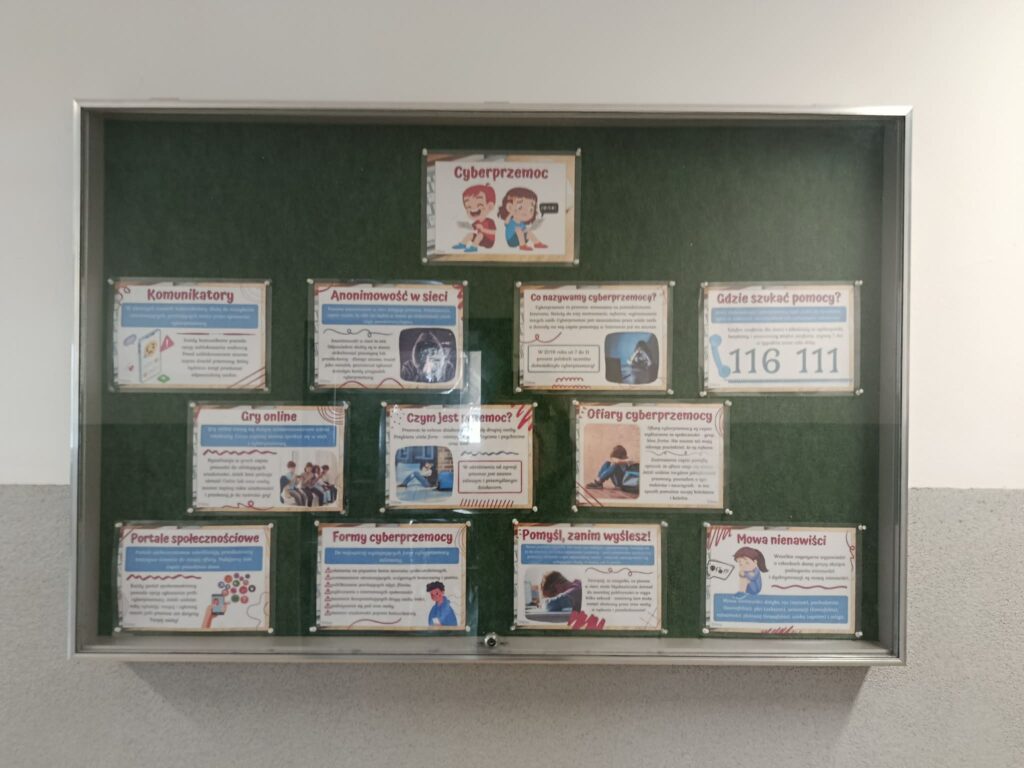 W tym tygodniu nauczyciele świetlicy na 1. piętrze stworzyli w gablocie na korytarzu gazetkę informacyjną poświęconą tematyce Cyberprzemocy.