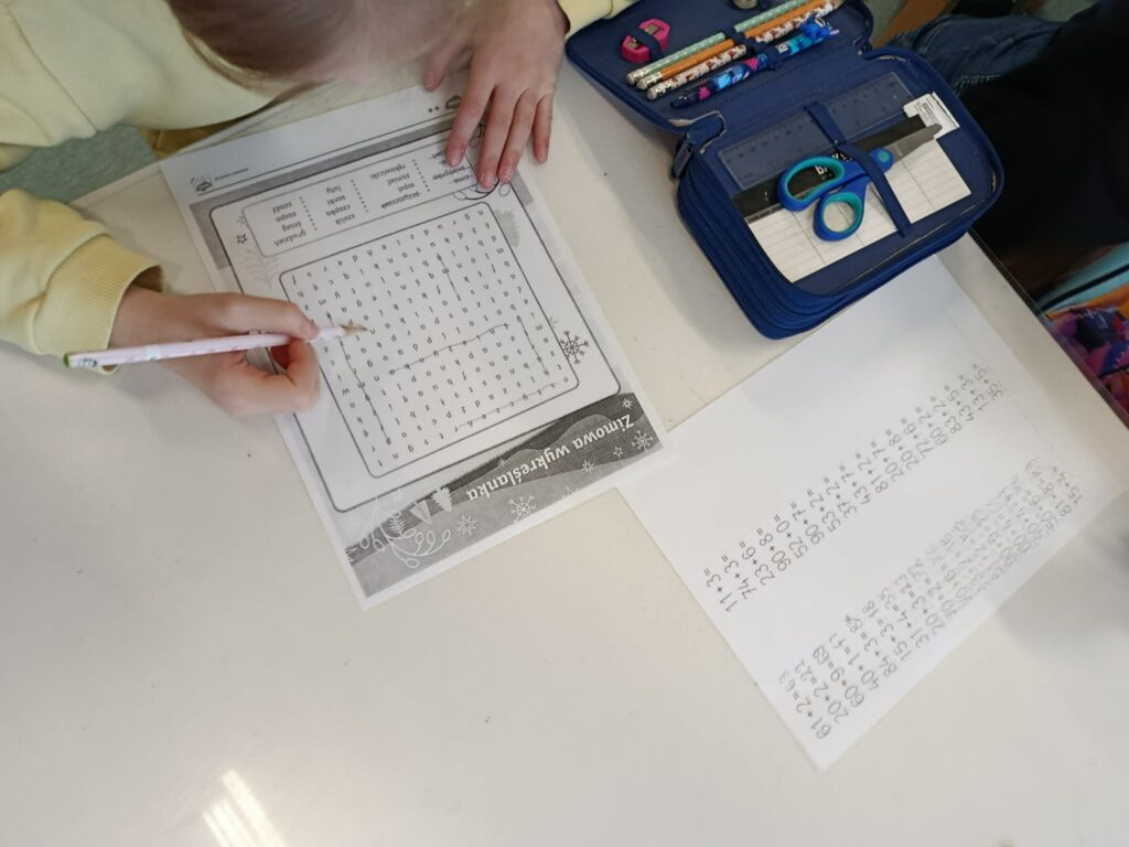 W tym tygodniu do świetlicy zawitała Pani Zima. Dzieci wspólnie ubierały choinkę, tworząc ciepłą i świąteczną atmosferę. Rozwiązywaliśmy także krzyżówki i labirynty związane z tematyką zimową. W ramach wyciszenia odbyła się zabawa „Podaj dzwonek jak najciszej”, która ćwiczyła koncentrację oraz delikatność ruchów. Świetliczaki wykonały przepiękne prace plastyczne: „Choinka”, „Bałwan” oraz „Mikołaj”. Dzieci mogły wykazać się kreatywnością, a kolorowe prace wprowadziły wszystkich w magiczny nastrój zbliżających się Świąt.