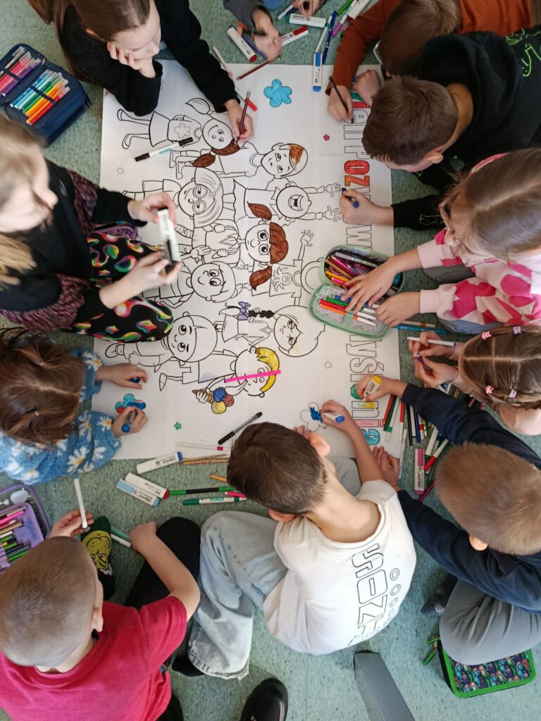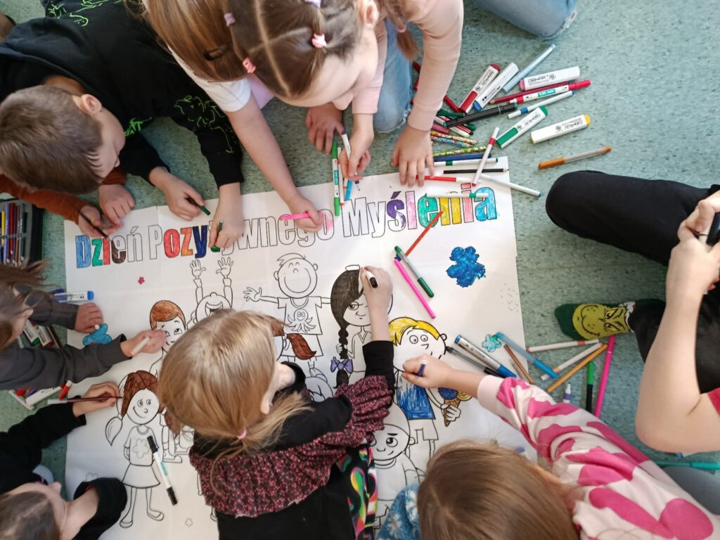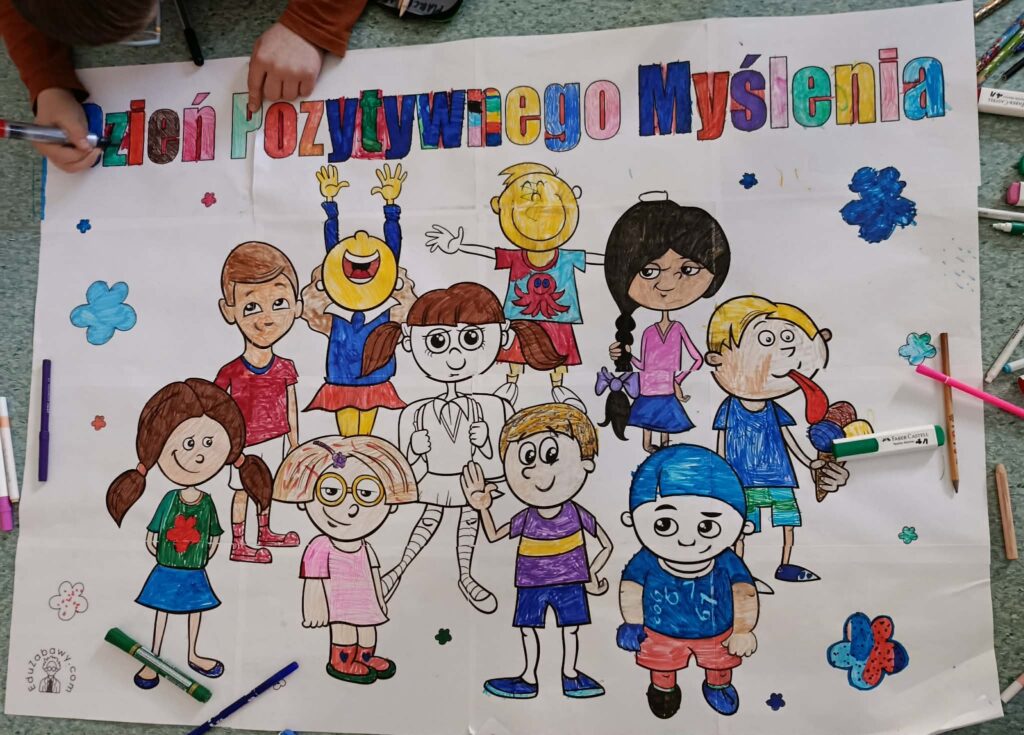 2 lutego obchodziliśmy Dzień Pozytywnego Myślenia. Świetliczaki z tej okazji wspólnie pokolorowały wielkoformatową kolorowankę pt. „Dzień Pozytywnego Myślenia”. Dzięki współpracy stworzyliśmy dzieło pełne radości i optymizmu. Podczas zajęć rozmawialiśmy o tym, czym jest pozytywne myślenie oraz jak miłe słowa i uśmiech mogą wpływać na nasze samopoczucie i relacje z innymi. Dzieci chętnie dzieliły się swoimi przemyśleniami i przykładami dobrych chwil z życia codziennego. To był dzień pełen uśmiechu i pozytywnej energii. Na zakończenie zajęć każdy uczeń wylosował „dobrą myśl”, która miała sprawić, aby reszta dnia upłynęła w miłej i radosnej atmosferze.