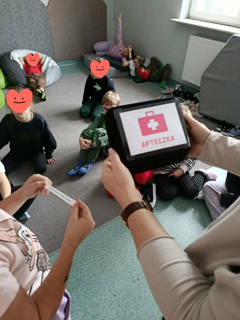 ⭐Dzieci dowiedziały się, jak należy zachować się w sytuacji zagrożenia zdrowia lub życia oraz w jaki sposób prawidłowo wezwać pomoc.