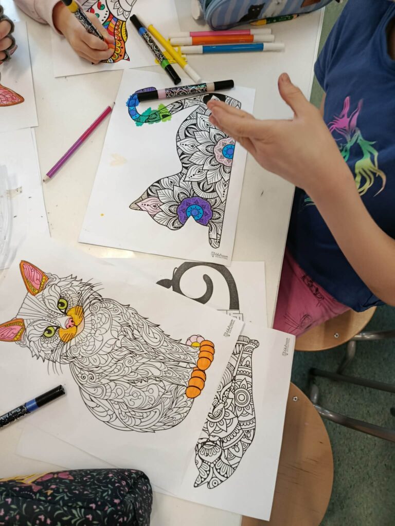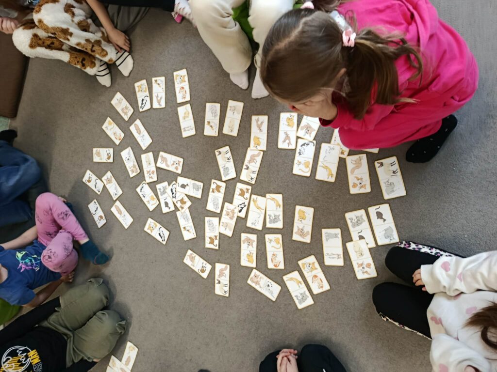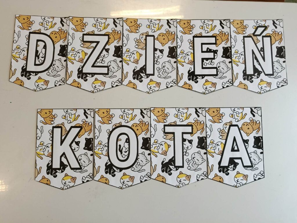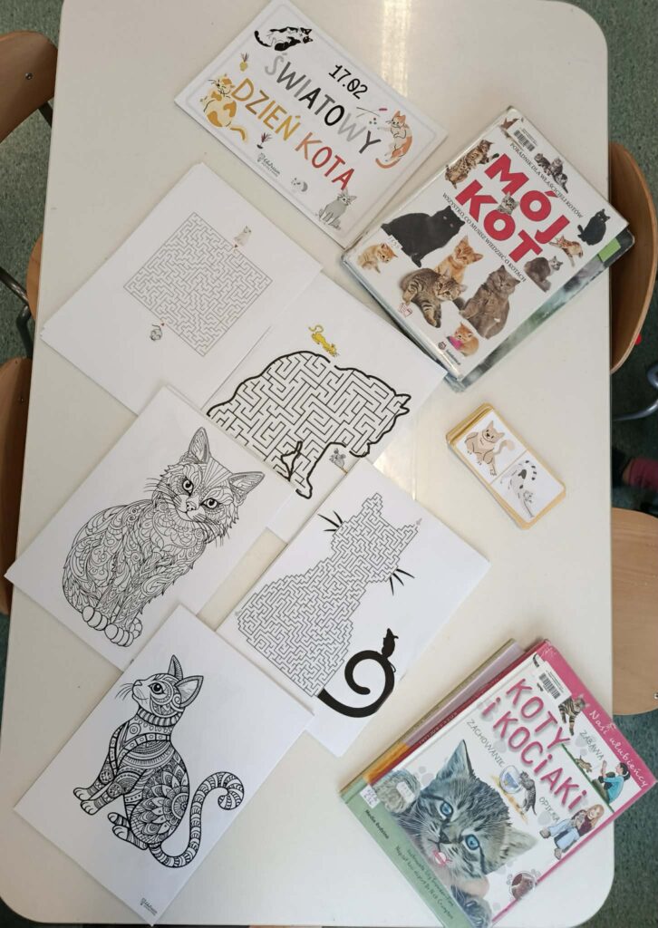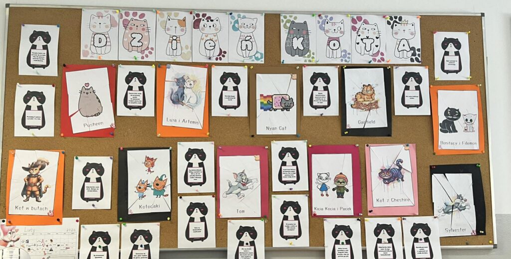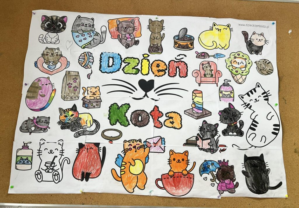 Dzień Kota w świetlicy. Podczas zajęć: • układałyśmy puzzle z kotami z bajek, • poznawałyśmy ciekawostki o kotach, • stworzyłyśmy wspólny, kolorowy plakat, • a dzieci z radością opowiadały o swoich ukochanych pupilach. To był czas pełen uśmiechu, kreatywności i pięknych rozmów o zwierzętach Dziękujemy dzieciom za zaangażowanie i wspaniałą atmosferę! Wszystkie materiały wykorzystane podczas zajęć pochodzą ze strony www.dzieckiembadz.pl – dziękujemy za inspiracje