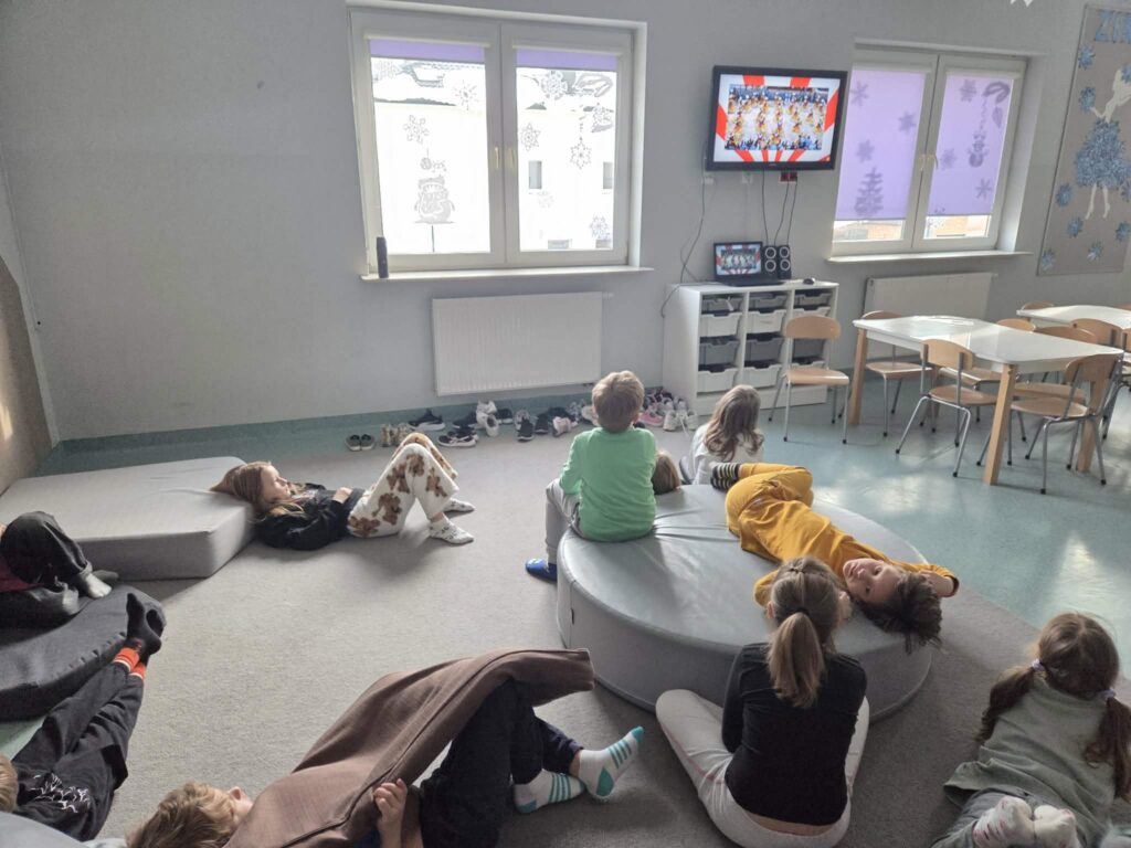 Kino w świetlicy – jesienny relaks po szkolnym tygodniu. Dziś nasza świetlica zamieniła się w małe kino. Dzieci mogły wygodnie rozsiąść się na materacykach, obejrzeć film i chrupać popcorn. To był czas odpoczynku, wyciszenia i wspólnego spędzania chwil w przyjaznej, jesiennej atmosferze. Takie dni to nie tylko zabawa, ale też nauka wspólnego przeżywania emocji, współpracy i budowania dobrych relacji. W świetlicy staramy się, by każde dziecko mogło znaleźć tu coś dla siebie – trochę radości, trochę relaksu i dużo ciepła. Na zdjęciach widać, jak bardzo dzieci potrafią cieszyć się wspólnymi, spokojnymi chwilami – to dla nas największa radość.