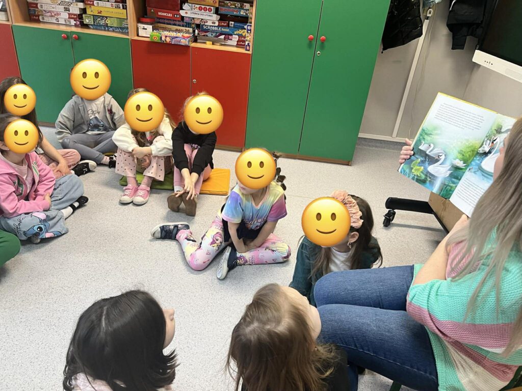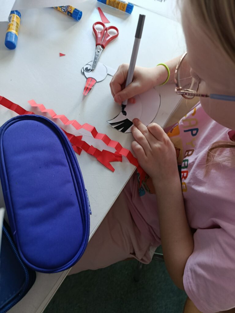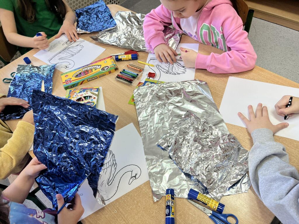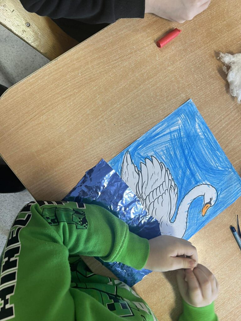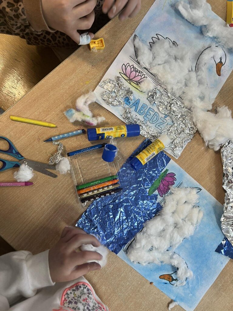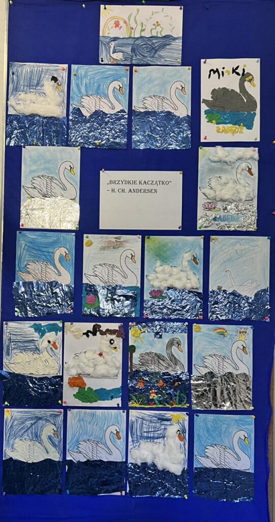W świetlicy, w tym tygodniu, dzieci poznały postać Hansa Christiana Andersena. Nauczyciel prowadzący zajęcia świetlicowe przeczytał bajkę „Brzydkie kaczątko”, która stała się inspiracją do rozmowy o akceptacji, empatii oraz tym, że każdy z nas jest wyjątkowy. Na zakończenie zajęć dzieci wykonały piękne prace plastyczne przedstawiające łabędzie. Powstała wyjątkowa galeria pełna kreatywności i wrażliwości.