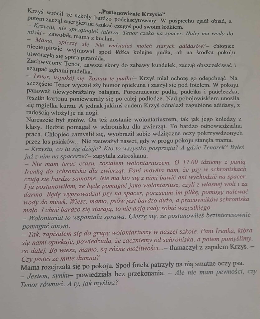 Kotek z gazety . W świetlicy kotek dziś powstał mały, uszka z papieru, ogon wspaniały. Nie miauczy wcale, lecz każdy wie, że kotek z gazety cudowny jest.