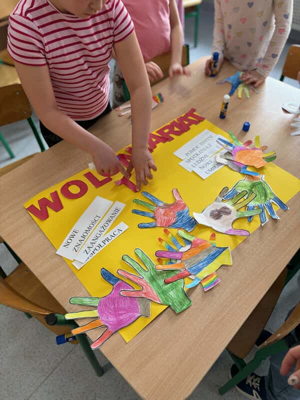 W ostatnim tygodniu w świetlicy odbyły się zajęcia na temat wolontariatu. Dzieci dowiedziały się z przygotowanej prezentacji- co to takiego wolontariat, kim jest wolontariusz, w jakich miejscach potrzebna jest pomoc wolontariuszy , a także co daje nam wolontariat. Wspólnie uzupełniły krzyżówkę. Aktywnie odpowiadały na pytania do przeczytanego opowiadania. W części plastycznej stworzyły plakat wykorzystując dłoń jako symbol ,, pomocnej dloni „jaką wolontariusz wyciąga do osoby potrzebującej.