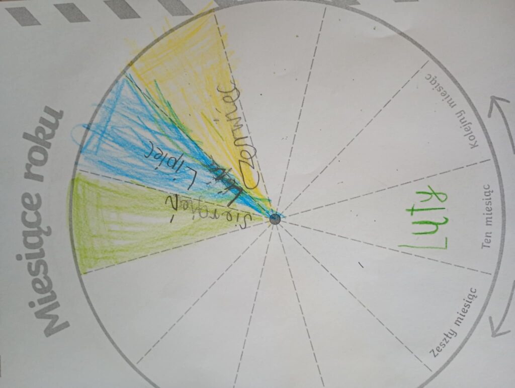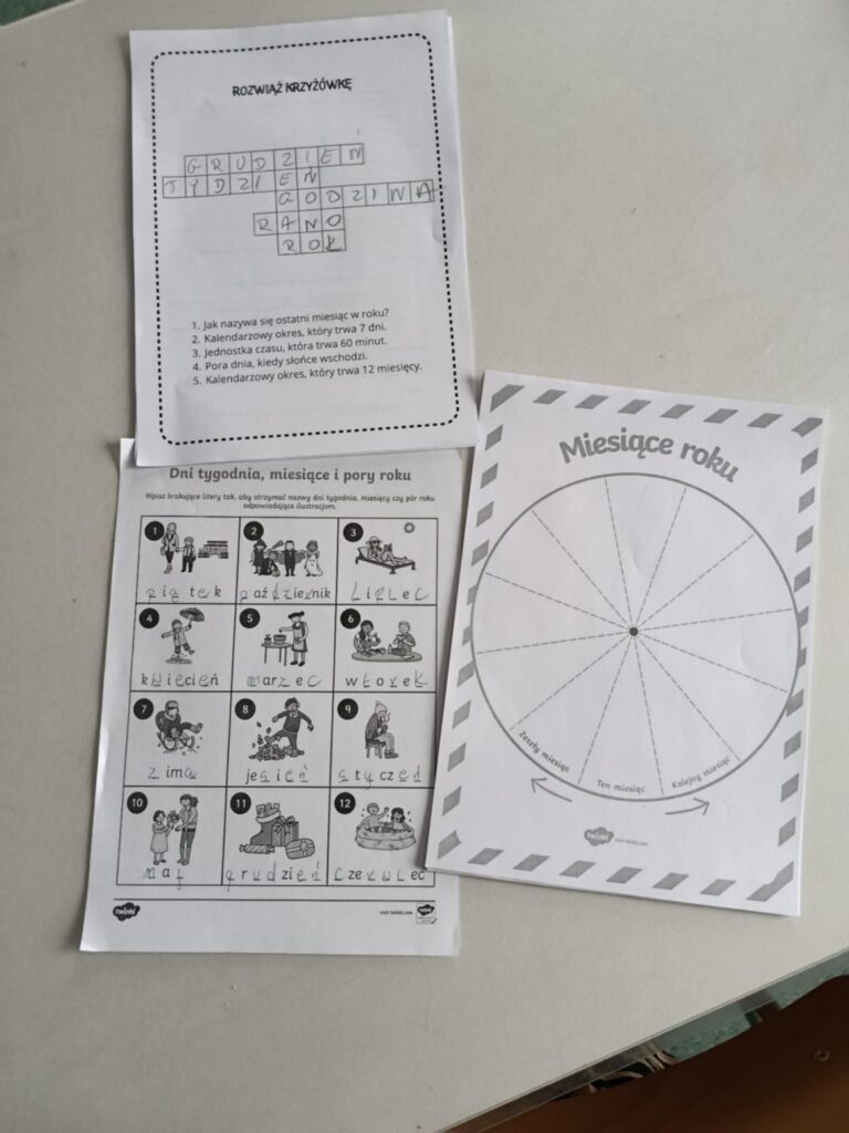 W dniu dzisiejszym starszaki realizowały projekt „Czas na zegar”. Tematem zajęć była budowa zegara. Poznaliśmy różne rodzaje zegarów jakie powstały na przestrzeni lat. Poznaliśmy budowę zegara. Nauczyliśmy się oraz poćwiczyliśmy odczytywanie godzin z zegara analogowego. Poznaliśmy jednostki miary czasu. Z rozsypanki dopasowaliśmy podpisy do poszczególnych zegarów oraz stworzyliśmy tarcze zegara. Obejrzeliśmy film edukacyjny który przybliżył nam upływ czasu oraz metody odczytywania czasu. Na koniec każdy stworzył własny zegar i zaznaczył podaną godzinę.