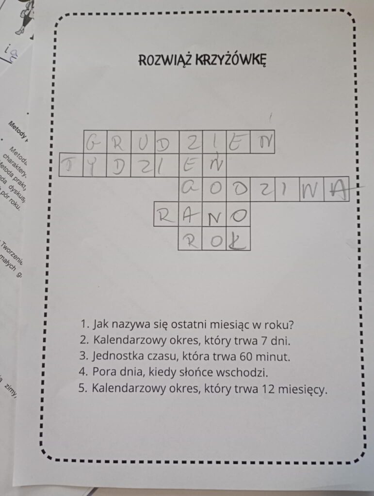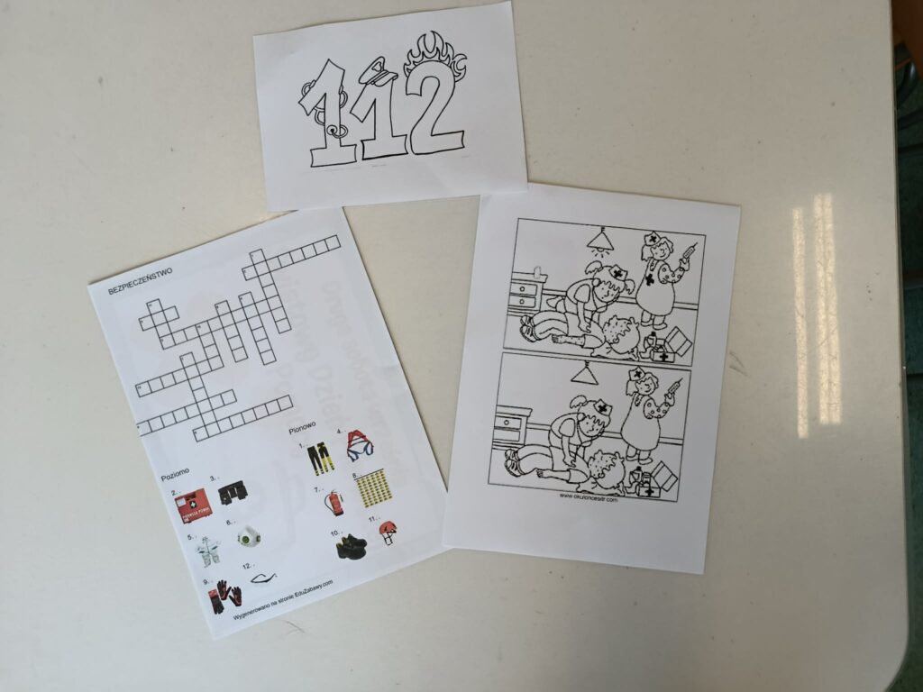 Podczas zajęć dzieci rozwiązywały również krzyżówki i łamigłówki dotyczące pierwszej pomocy oraz wykonywały karty pracy związane ze służbą zdrowia (wyszukiwanie różnic, krzyżówki, wykreślanki).