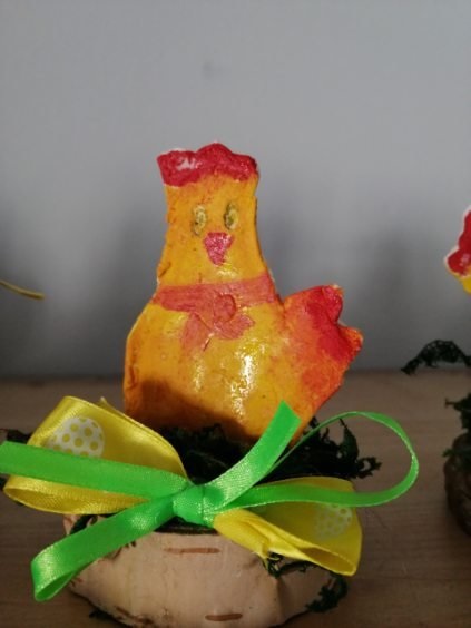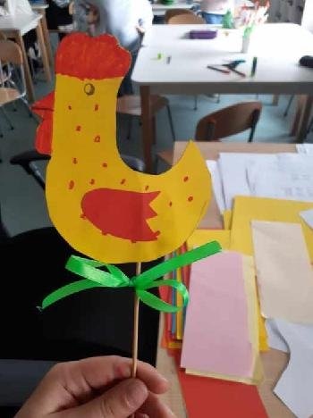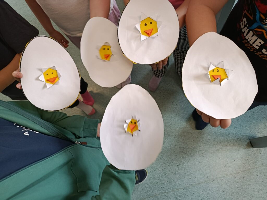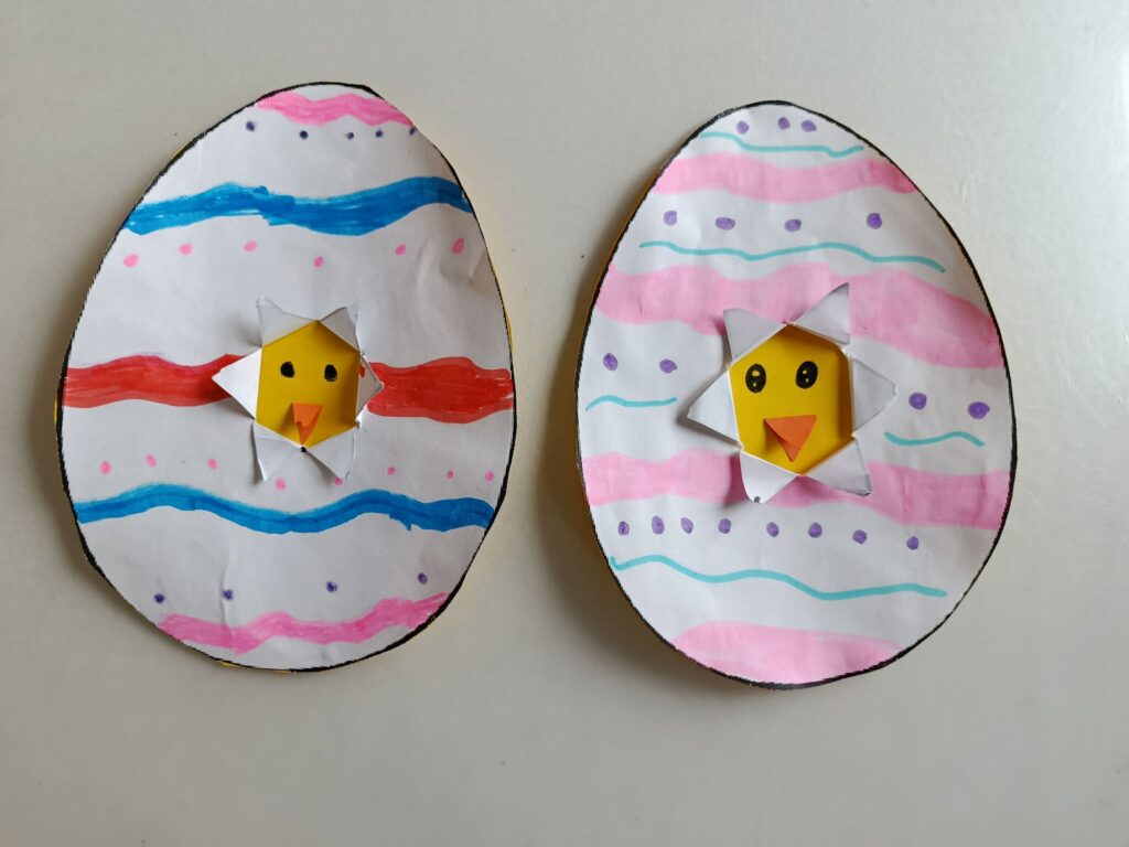 „Kurczaczek ukryty w papierowym jajku” – praca wykonana z wykorzystaniem technik wycinania, klejenia i rysowania,