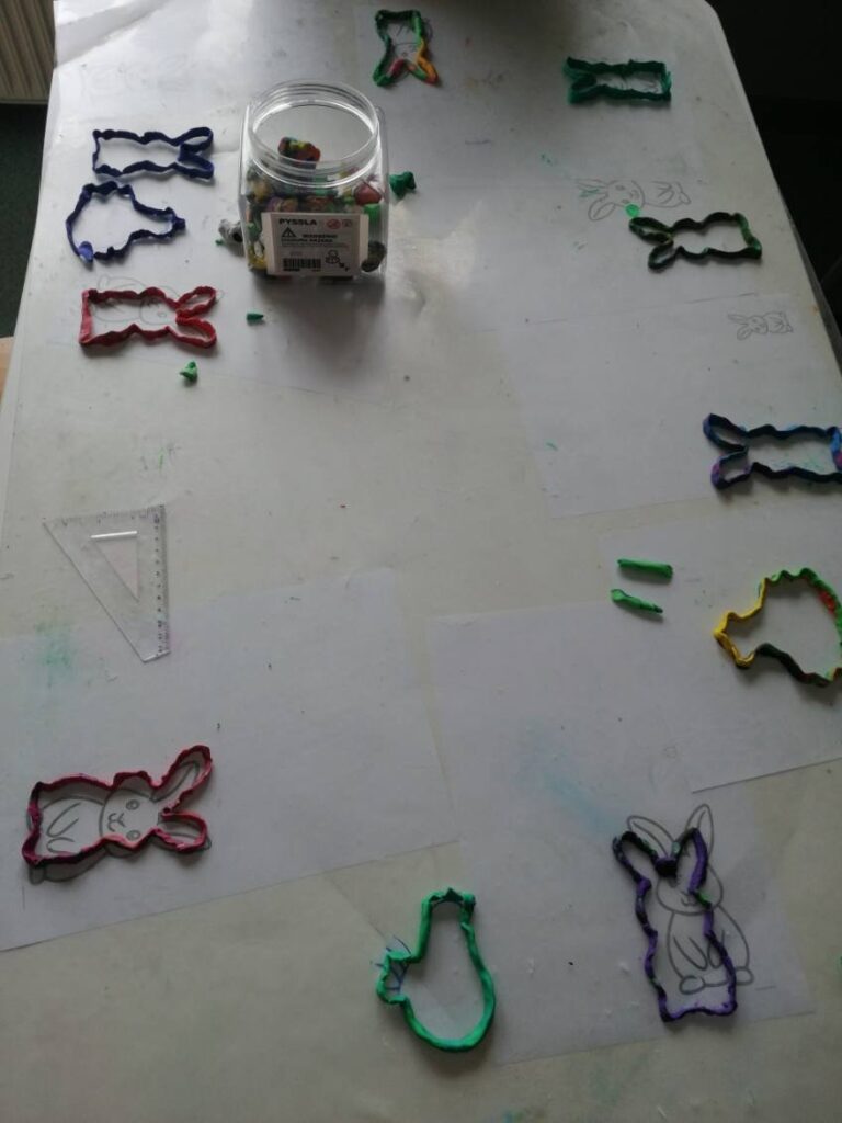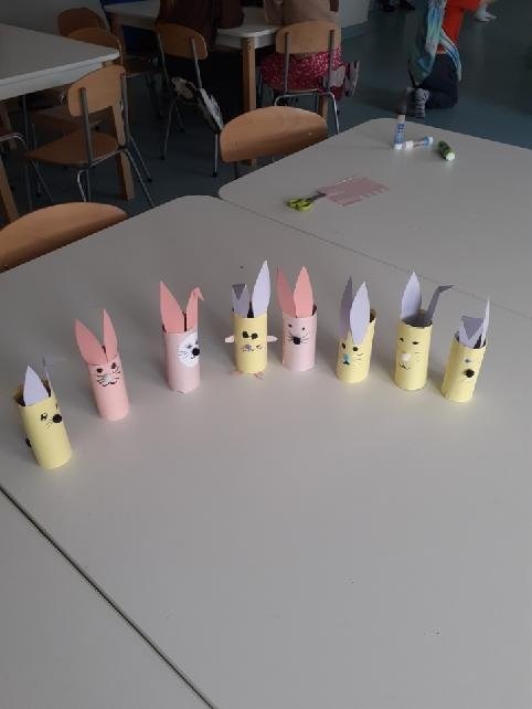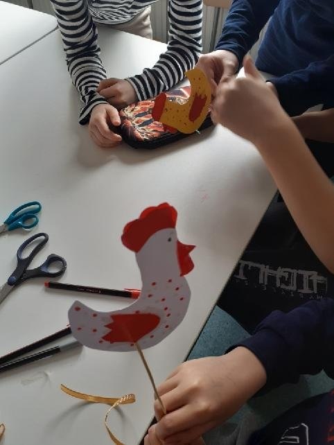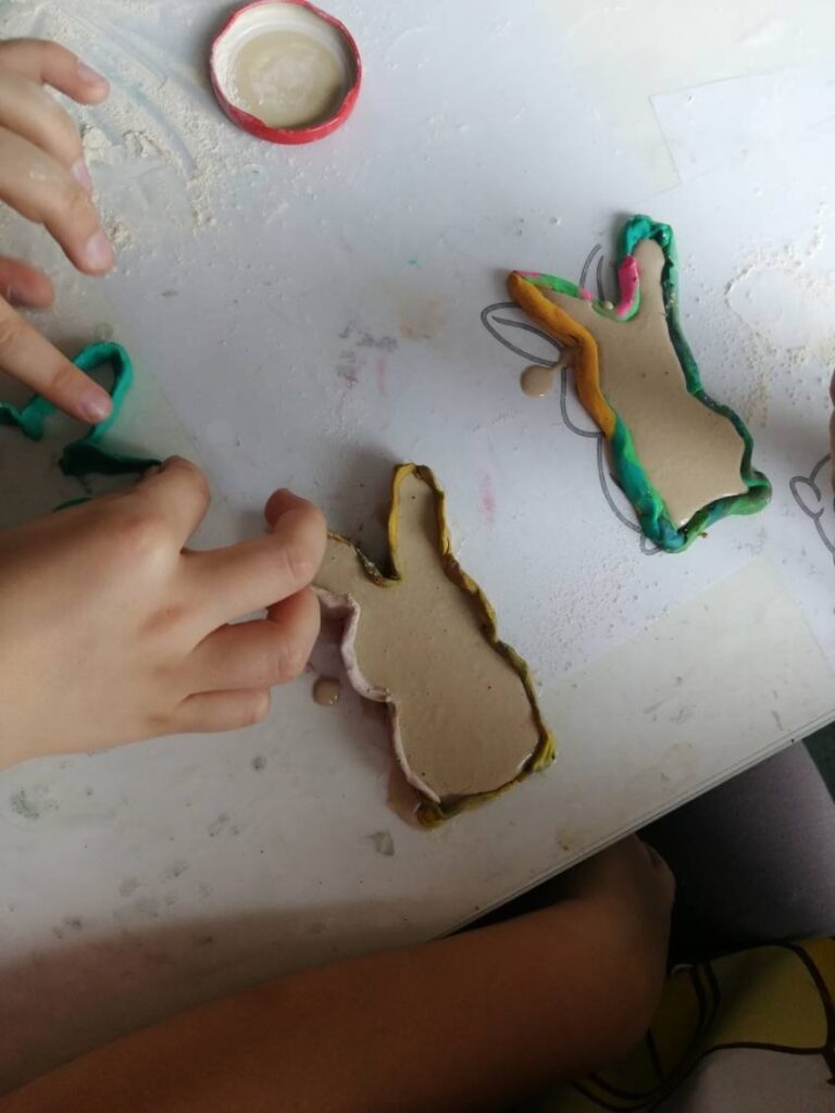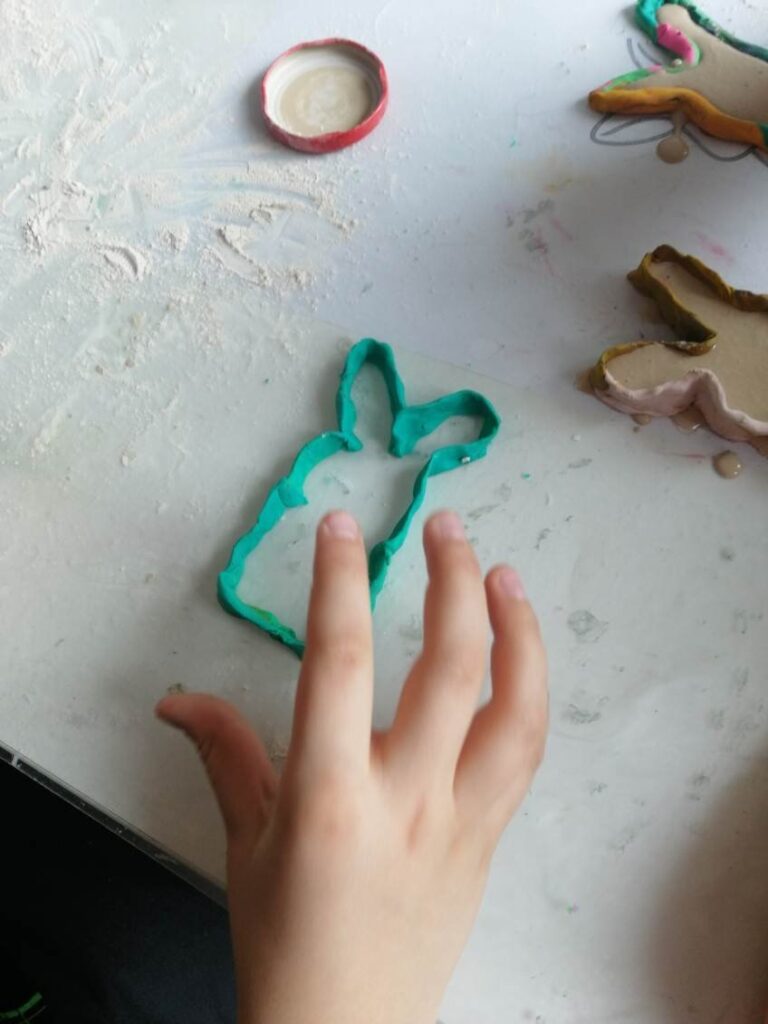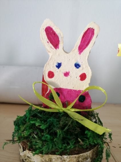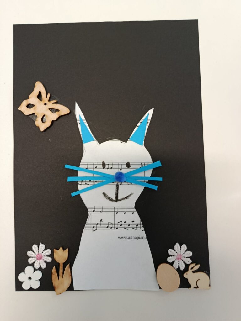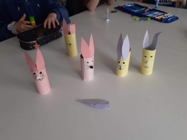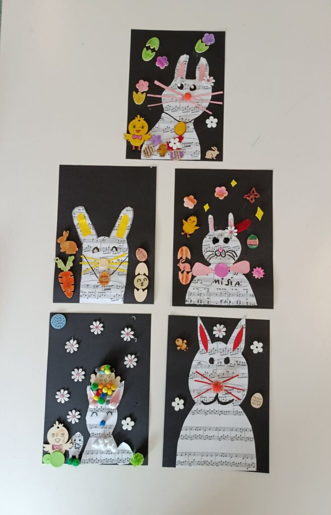 Podczas zajęć powstały piękne i kreatywne prace, takie jak: „Królik” – wycinany z papieru nutowego i ozdabiany według własnego projektu,