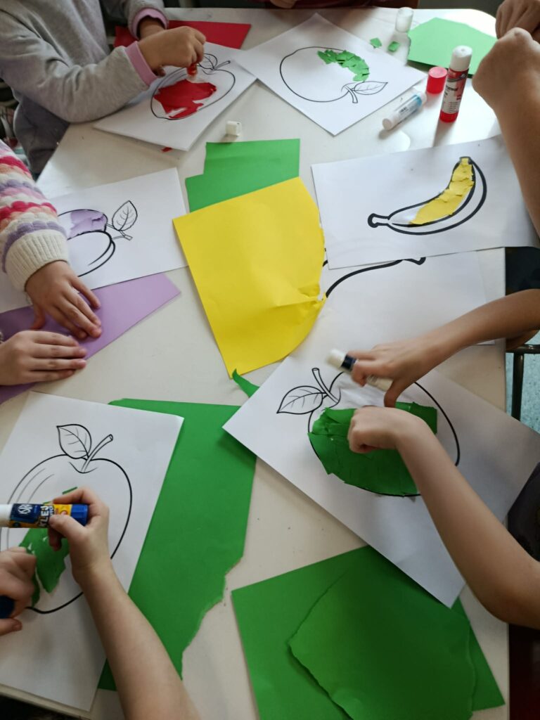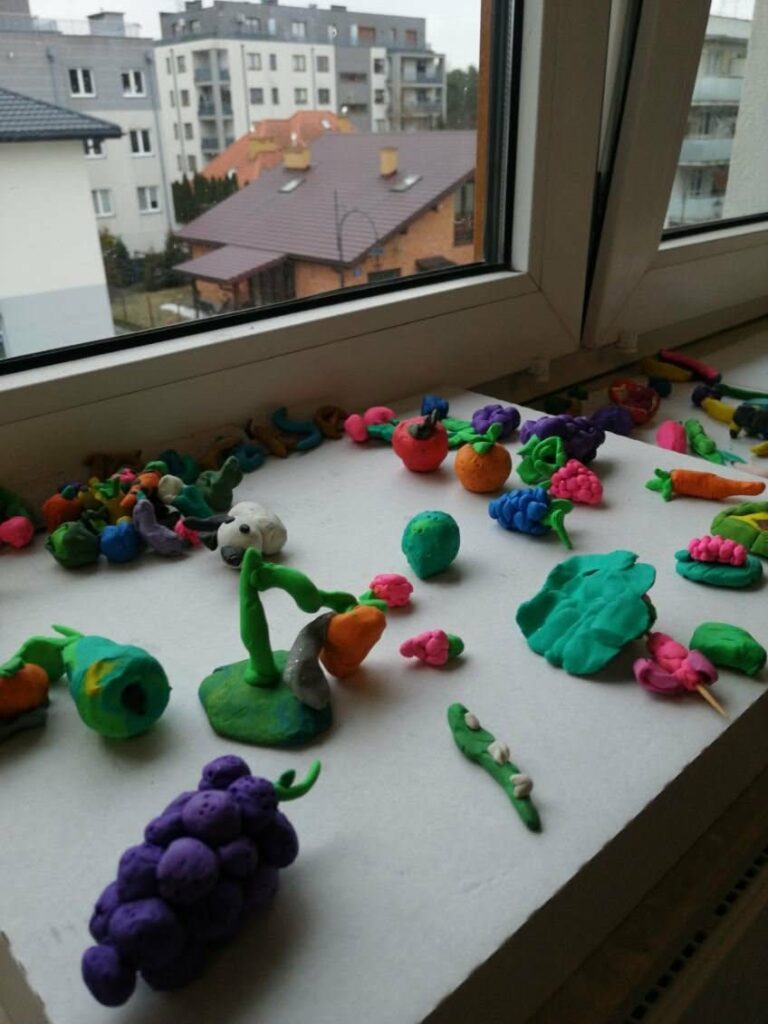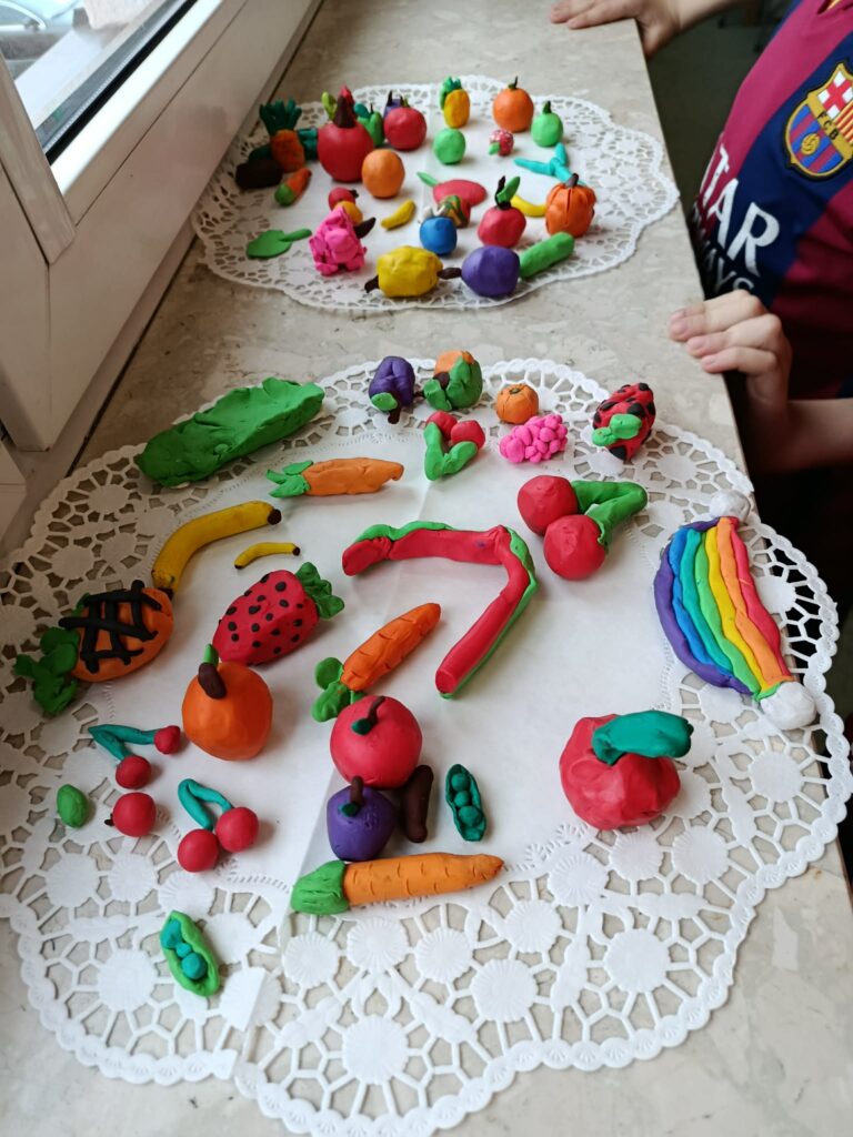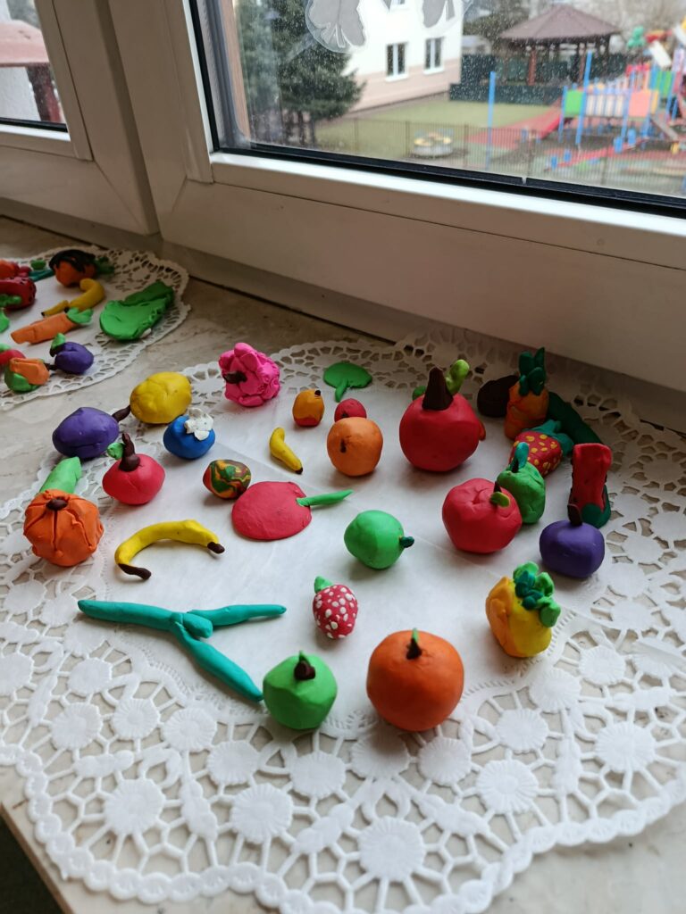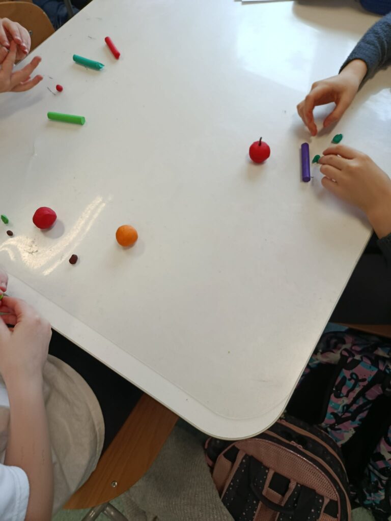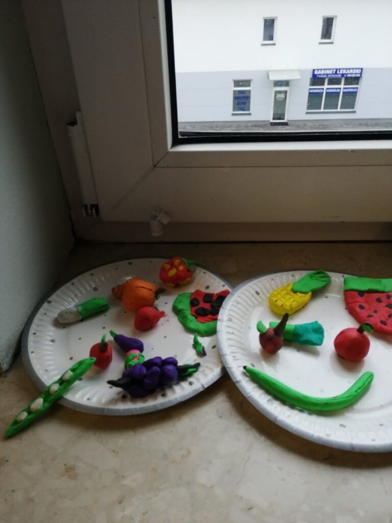 Świetliczaki obejrzały film „Piramida zdrowego żywienia”. W części plastycznej wykonały dwie prace pt. „Owoce i warzywa”– metodą wydzieranki oraz lepienia z plasteliny.
