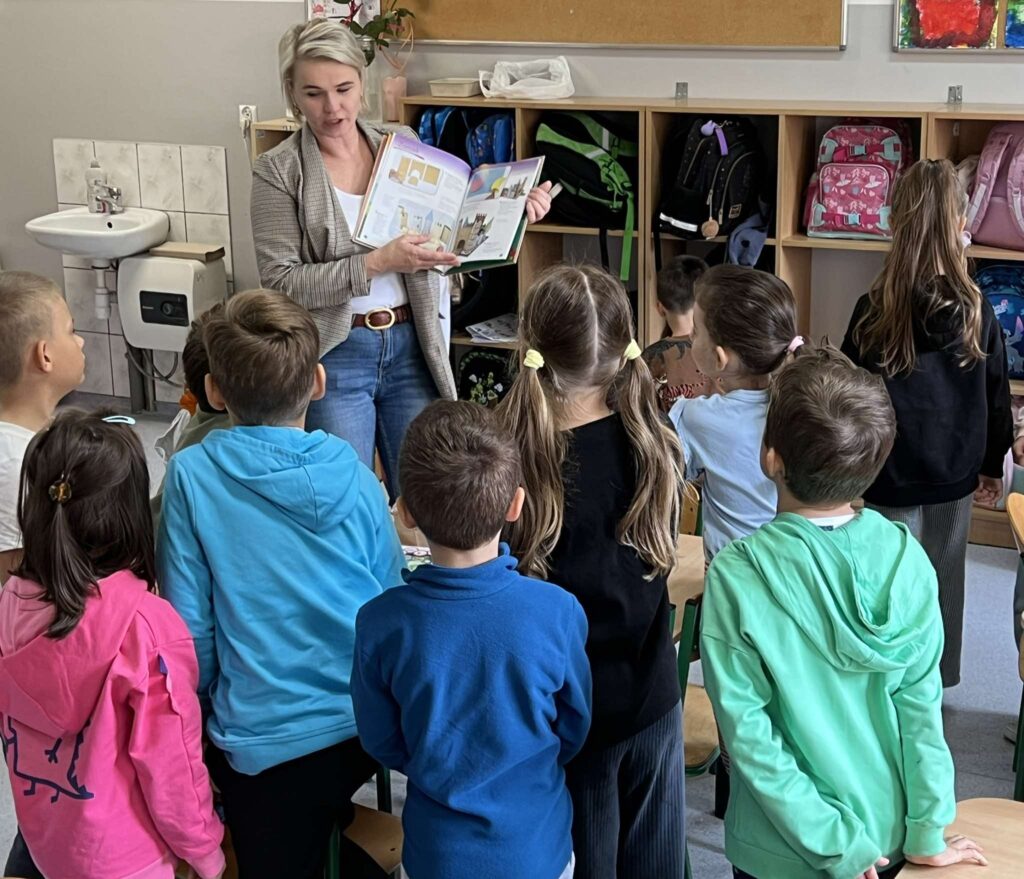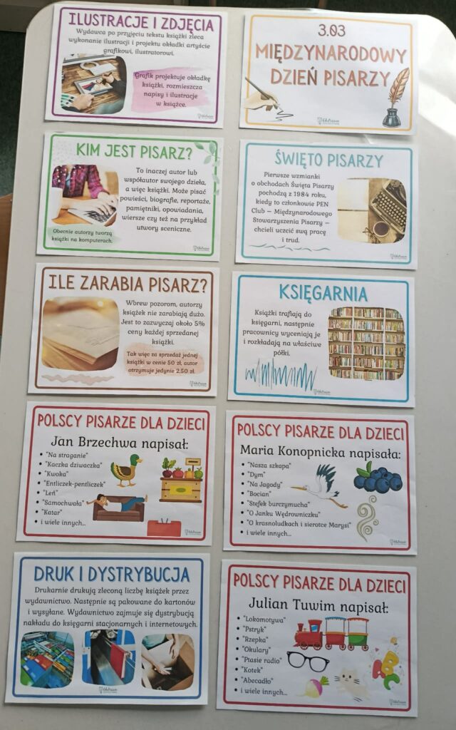 W tym tygodniu podczas zajęć dzieci poznały znaczenie Międzynarodowego Dnia Pisarza, obchodzonego 3 marca. Rozmawialiśmy o tym, kim jest pisarz oraz jakie książki dzieci lubią czytać. Nauczyciel zaprezentował kilku znanych autorów książek dla dzieci i przeczytał fragment utworu, np. „Okulary” J. Tuwima. Następnie dzieci wzięły udział w zabawie grupowej – przy stolikach dopasowywały ilustracje do odpowiednich bajek. Na zakończenie wcieliły się w rolę pisarzy i stworzyły własny projekt strony tytułowej książki. Zajęcia rozwijały wyobraźnię i kreatywność oraz zachęcały dzieci do czytania książek.