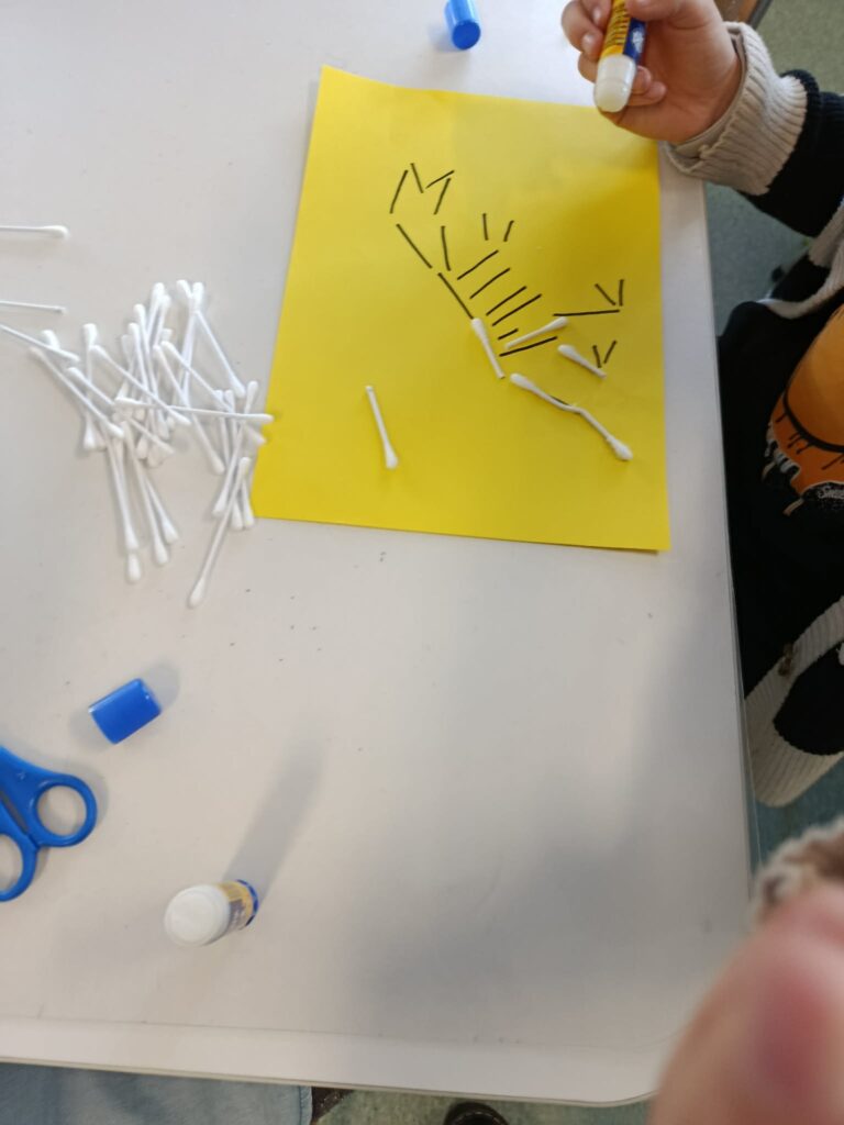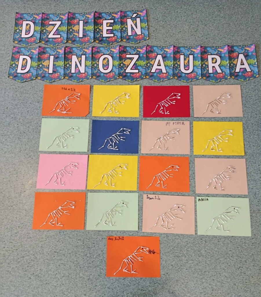W części plastycznej wykonały pracę pt. „Szkielet dinozaura”, tworząc go z patyczków higienicznych przyklejanych do kartki.