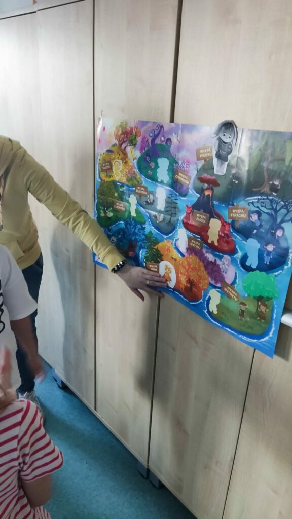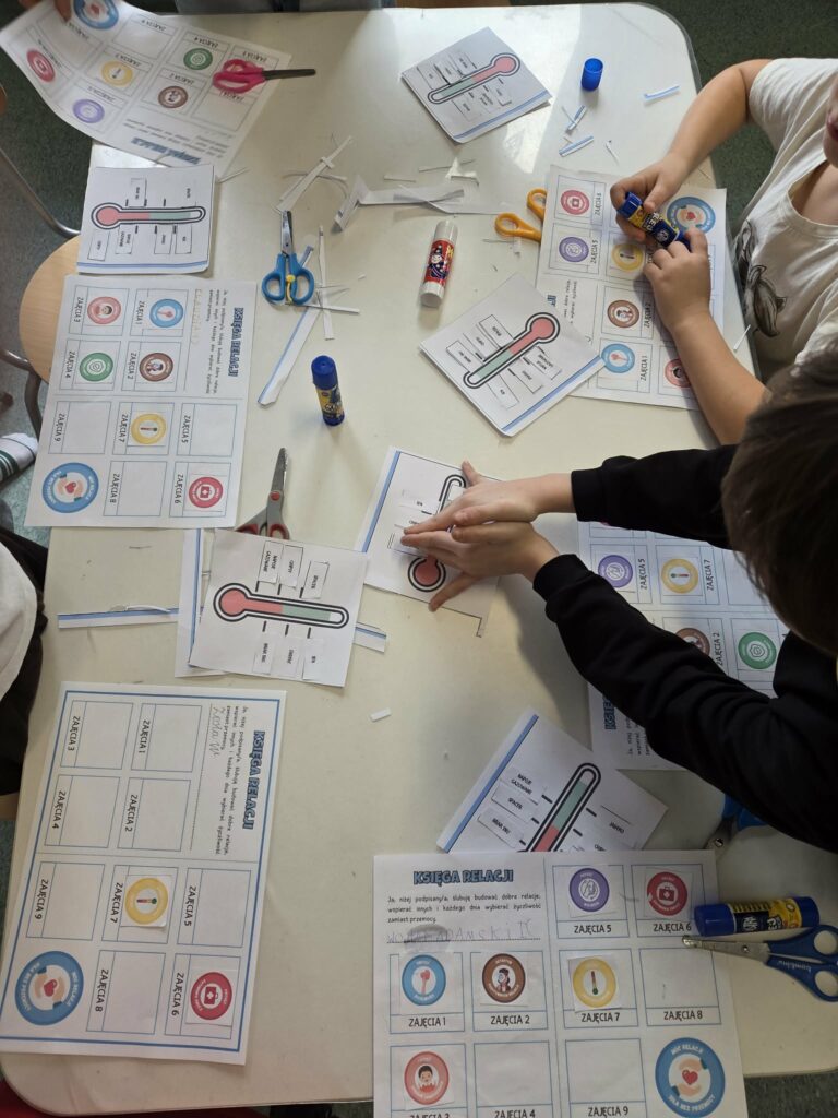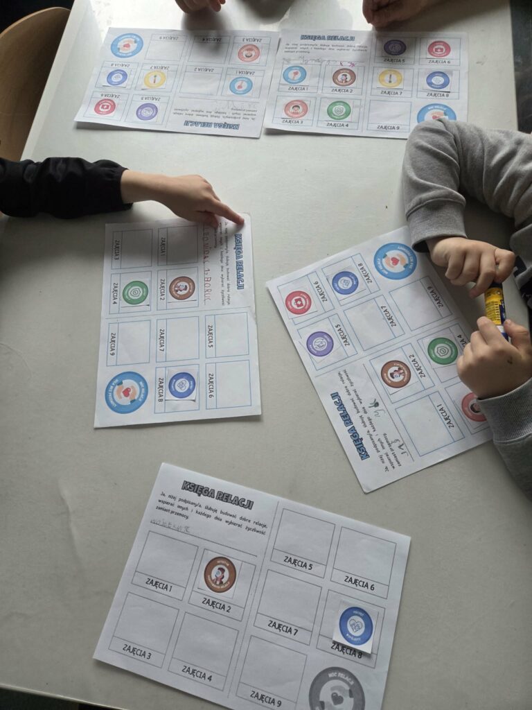 Tym razem wykonały zadanie „Emocję pod lupą – poznaję siebie” : tworzyły „Mapy emocji” (przyklejanie emocji w częściach ciała, gdzie je czujemy), „Kompas emocji” (dopasowanie emocji do sytuacji), „Wyspy emocji” (rysowanie obrazków związanych z nazwą wyspy), grały w grę interaktywną „Koło fortuny”, była zabawa wyciszająca „Muzyczne pokoje”, a także eksperyment „Słoik spokoju”. Na koniec wkleiły kolejną pieczątkę go Księgi Relacji.