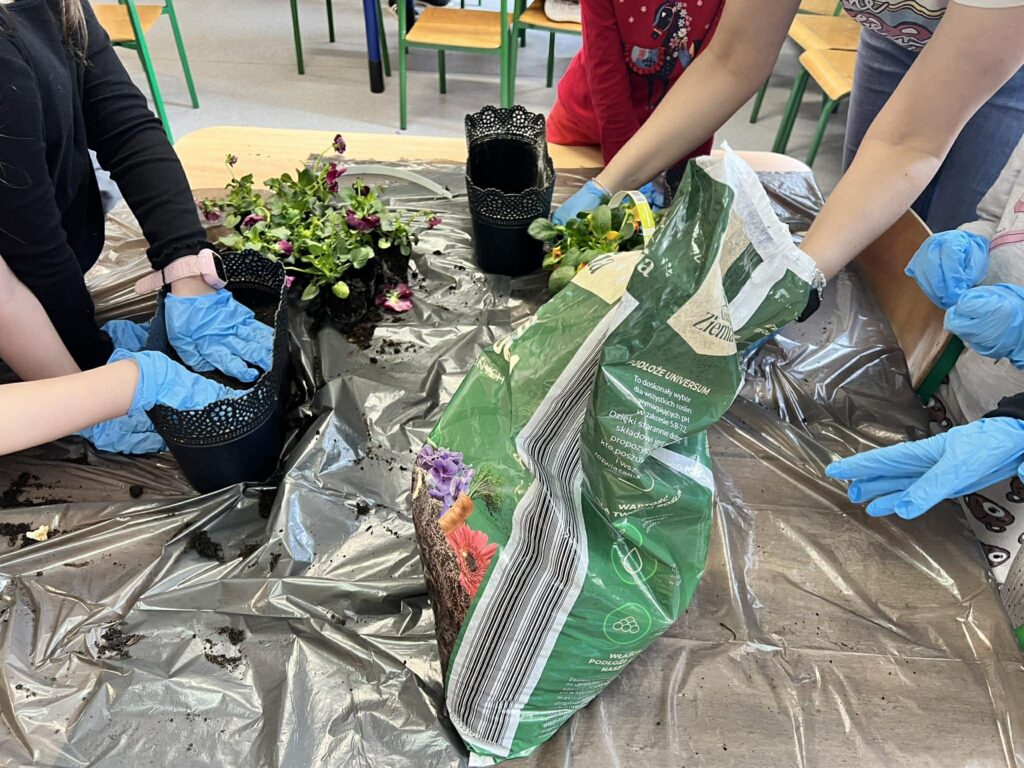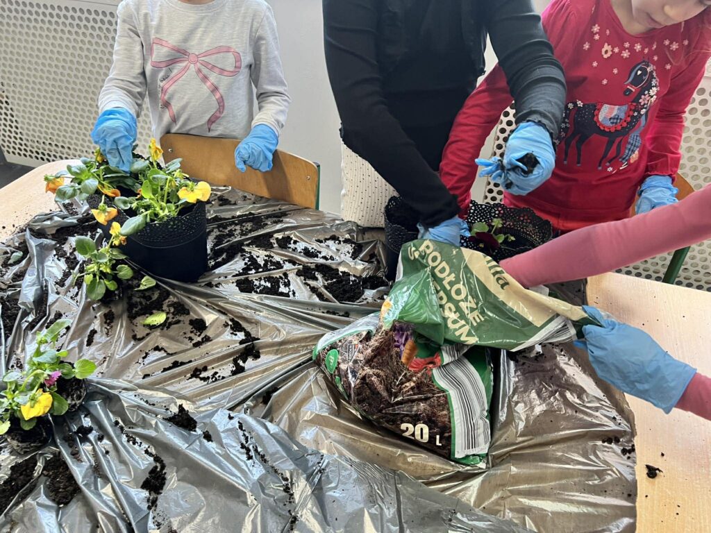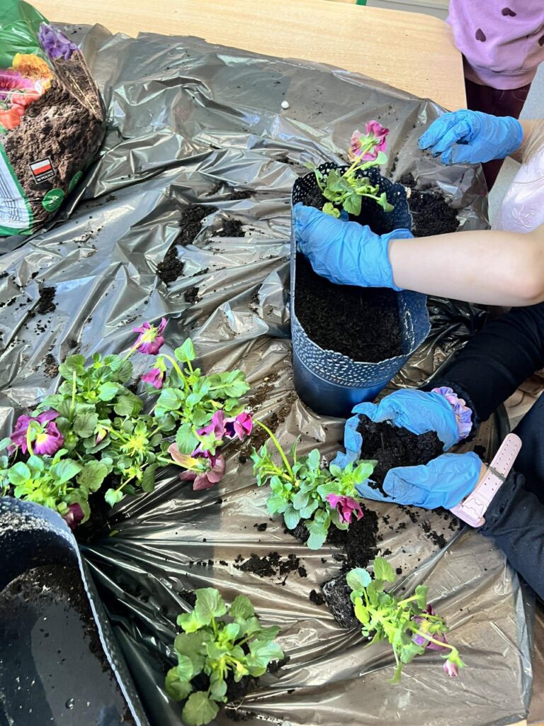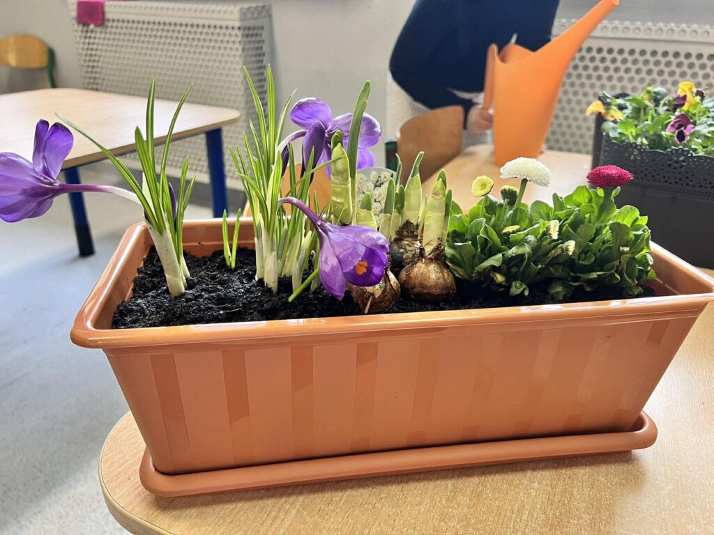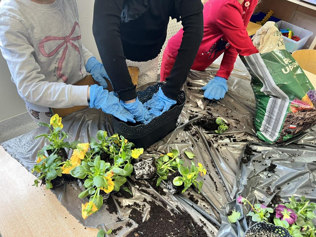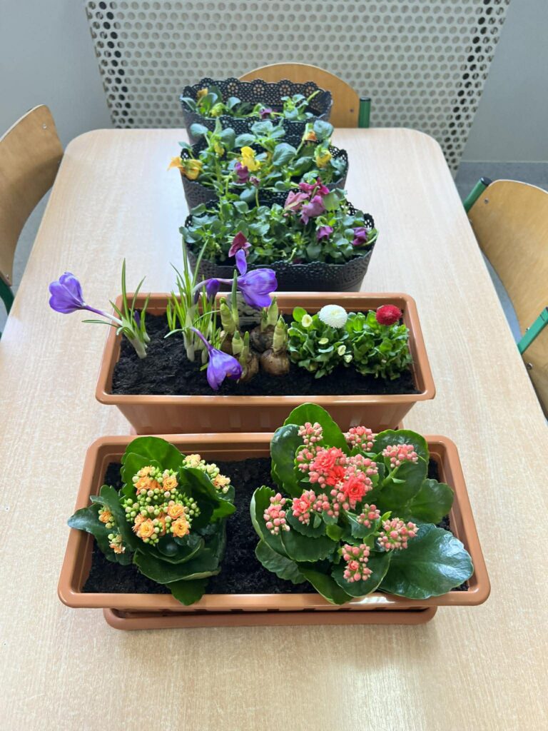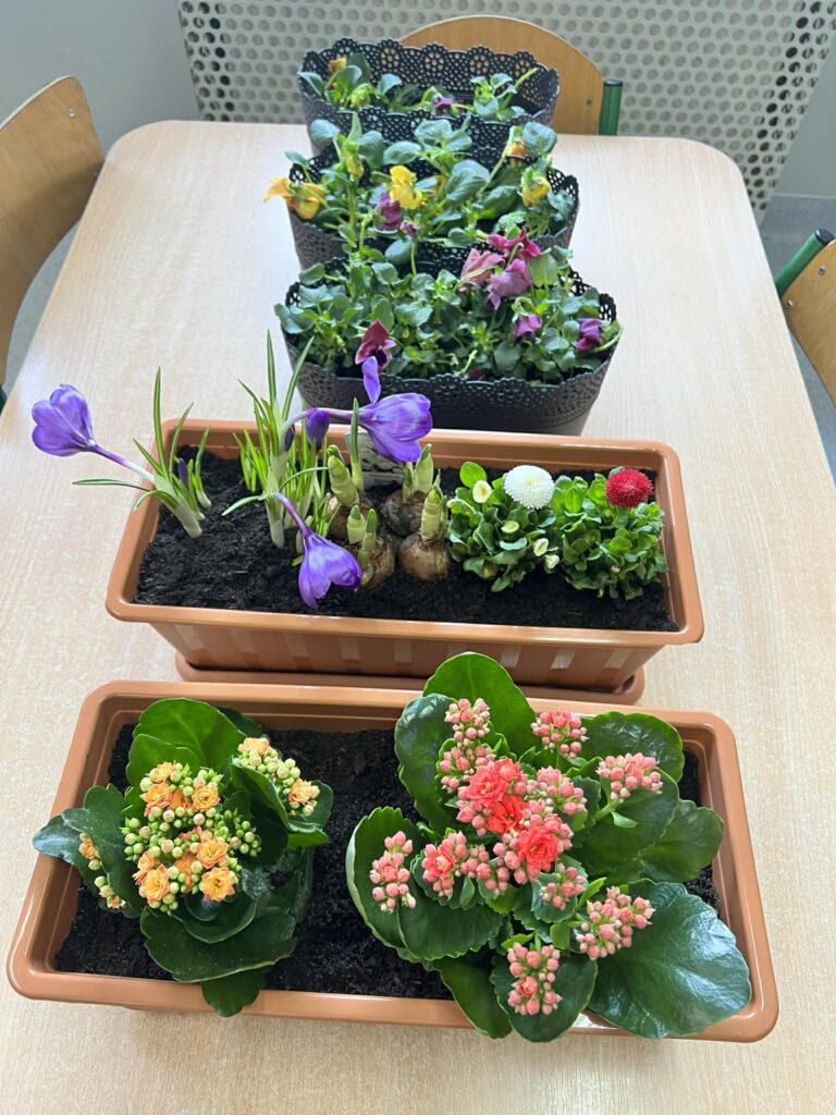 Zamieniliśmy się w małych ogrodników i sadziliśmy bratki, krokusy, hiacynty oraz inne wiosenne kwiaty. Była to nie tylko świetna zabawa, ale też mała lekcja przyrody – rozmawialiśmy o tym, czego rośliny potrzebują, aby pięknie rosły.