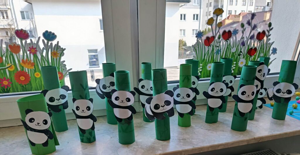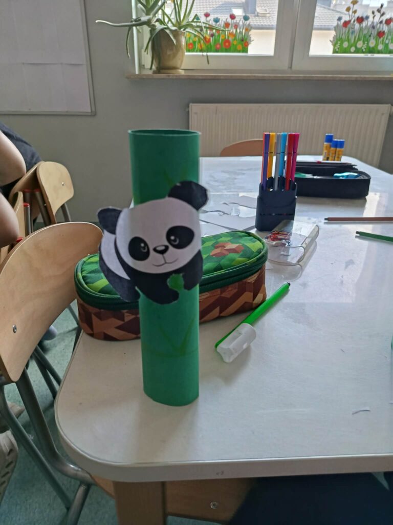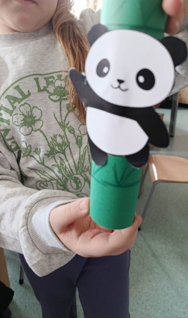 ⭐ Zajęcia obejmowały zabawę ruchową „Panda szuka bambusa” oraz pracę plastyczną – wykonanie pandy z wykorzystaniem zielonej rolki jako bambusa.