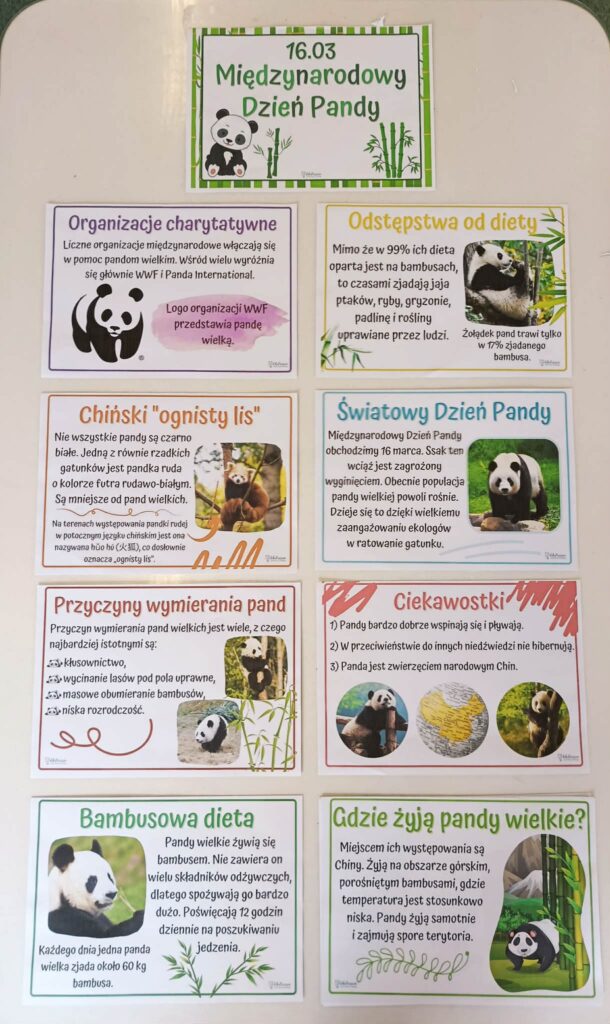 ⭐ Podczas zajęć dzieci poznały wygląd pandy, miejsce jej życia oraz sposób odżywiania, a także dowiedziały się, dlaczego należy chronić te zwierzęta i czym zajmuje się organizacja WWF.