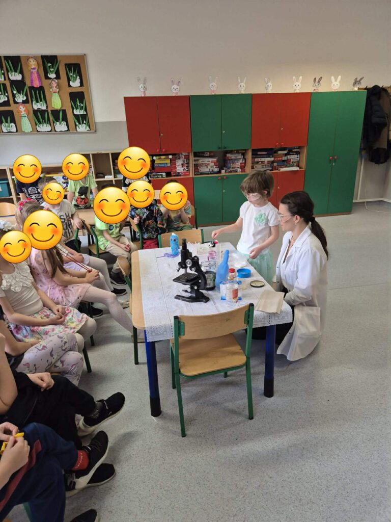 Na początku zajęć p.Paulina przybliżyła dzieciom czym zajmuje się chemik a także zwróciła uwagę jak ważne są zasady bezpieczeństwa podczas tej pracy.