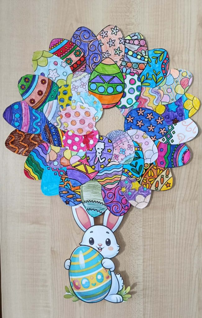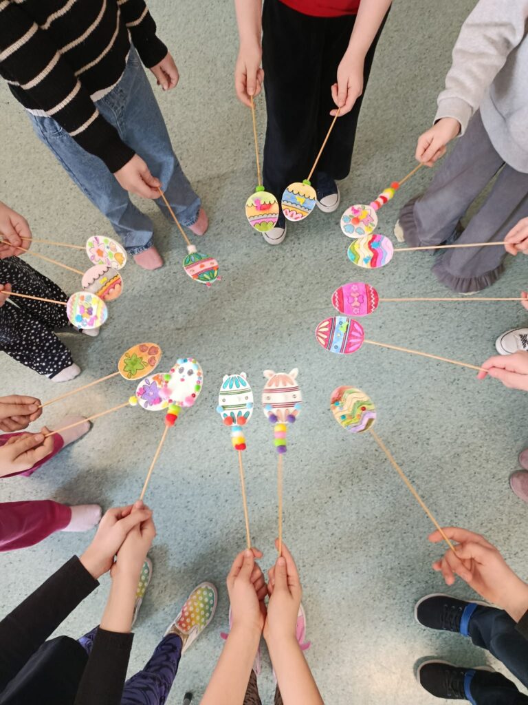 „Wieniec wielkanocny” – ozdabianie wyciętych pisanek oraz tworzenie wspólnego wieńca.